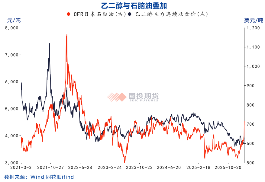 | 上周末爆发的中东地区地缘政治风险引发了全球能源市场剧烈震荡,对国内的化工品也产生了直接的影响。乙二醇主力2605合约从上周五的3700元/吨一线上涨至4000元/吨以上,连续两日收于涨停。伊朗局势对乙二醇的影响主要有原油带来的成本影响,中东生产及运输带来的进口影响及未来可能出现的国内生产下滑等,局势的演变也将继续影响乙二醇价格走势。 油气价格上涨对乙二醇有成本推动 国内以原油、石脑油及轻烃类为原料的乙二醇产能占比超60%,海外乙二醇生产原料以石脑油为主,中东和北美地区还有较大量乙烷制乙二醇。从长周期看,乙二醇的价格走势与石脑油保持较高的一致性,石脑油价格与油价密切联动。短期,中东局势引发油气大涨,3月2日CFR日本石脑油价格715.5美元/吨,比2月底上涨近79美元/吨,涨幅超12%,对乙二醇有直接的成本面利多。