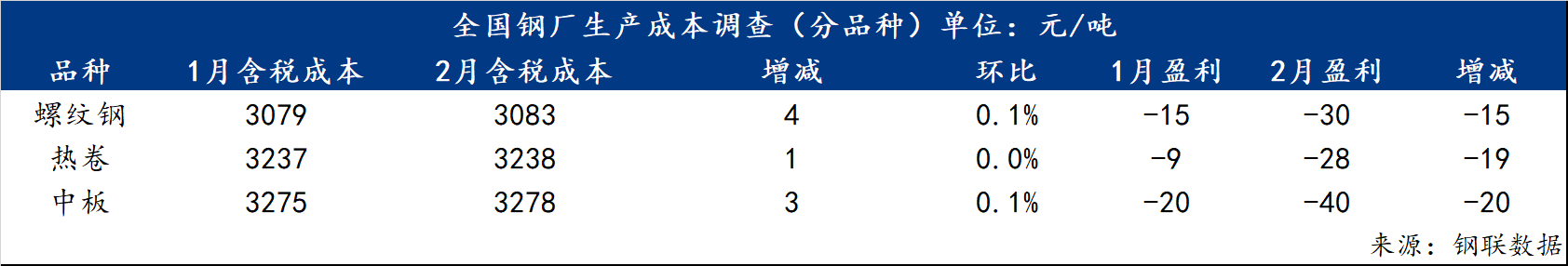 | 报告品种:螺纹钢 原文链接:https://gc.mysteel.com/a/26030217/08D0E14D8EDD4B8F.html 核心观点: (1)2月底对全国主要样本高炉生产企业进行调查,其产品生产成本小幅波动,幅度在3元/吨左右。数据显示,当前螺纹钢平均含税成本为3083元/吨,环比增加4元/吨,增幅0.1%;热卷平均含税成本为3238元/吨,环比上涨1元/吨,基本持平;中厚板平均含税成本为3278元/吨,环比上涨3元/吨,增幅0.1%。 (2)2月Mysteel(62%)铁矿石指数平均价在101美元,较上月下跌5美元;2月华北地区二级冶金焦均价为1427元/吨,较上月上涨43元/吨;2月唐山钢坯含税出厂价平均为2935元/吨,较上月下跌45元/吨。 (3)2月底对全国部分样本高炉生产企业盈利情况进行调查,螺纹钢样本平均利润-30元/吨,较上月盈利减少15元/吨,热卷样本平均盈利-28元/吨,较上月盈利减少19元/吨,中厚板样本平均盈利-40元/吨,盈利较上月盈利减少20元/吨。 长流程钢厂主要品种生产成本及盈利情况 Mysteel调查的全国91家高炉钢厂,2月底螺纹钢平均含税成本为3083元/吨,环比上涨4元/吨,增幅0.1%,盈利-30元/吨,减少15元/吨;热卷为3238元/吨,环比增加1元/吨,基本持平,盈利-28元/吨,减少-19元/吨;中厚板为3278元/吨,环比增加3元/吨,增幅0.1%,盈利-40元/吨,减少20元/吨。 表一:全国91家样本钢厂生产成本(分区域)调查统计(单位:元/吨)