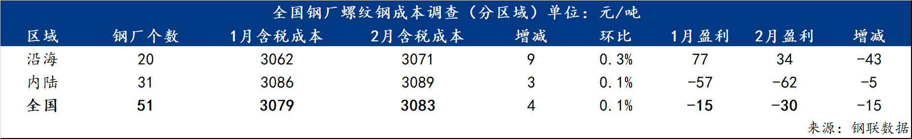 螺纹钢方面,2月底对全国51家螺纹钢生产企业调研了解到,螺纹钢平均成本为3083元/吨,环比增加4元/吨,增幅0.1%;分区域来看,沿海地区20家钢厂螺纹钢平均成本为3071元/吨,环比增加9元/吨,增0.3%;内陆地区31家钢厂螺纹钢平均成本为3089元/吨,环比增加3元/吨,增幅0.1%;盈利空间方面,2月份螺纹钢生产企业盈利空间在-30元/吨,环比减少15元/吨。 表二:全国51家主要样本高炉钢厂螺纹钢成本(分区域)调查统计(单位:元/吨)