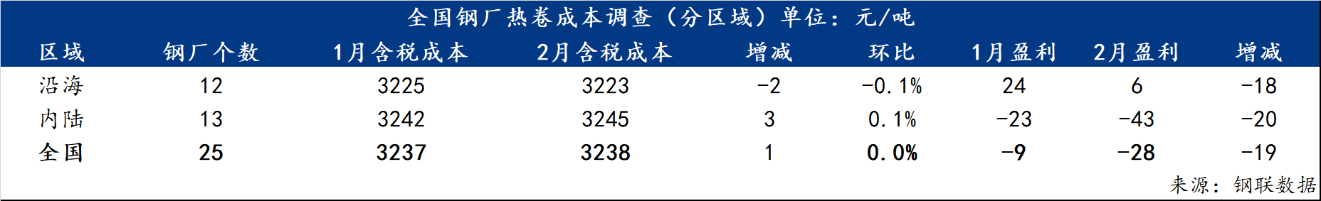 热卷方面,2月底对全国25家热轧板卷生产企业调研了解到,热卷平均成本为3238元/吨,环比增加1元/吨,基本持平;分区域来看,沿海地区12家钢厂热卷平均成本为3223元/吨,环比减少2元/吨,减幅0.1%;内陆地区13家钢厂热卷平均成本为3245元/吨,环比增加3元/吨,增幅0.1%;盈利空间方面,2月份热卷生产企业盈利-28元/吨,盈利环比减少19元/吨。 表三:全国25家主要样本高炉钢厂热卷成本(分区域)调查统计(单位:元/吨)