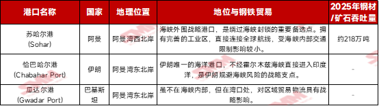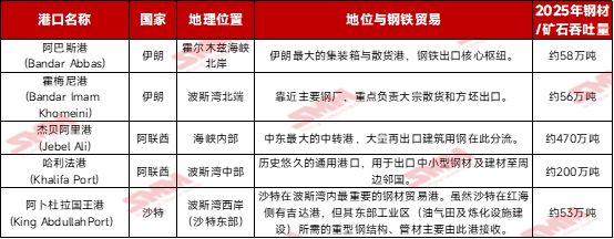 数据来源:SMM 霍尔木兹海峡内的核心港口影响测算估计 霍尔木兹海峡这一咽喉要道发生物理封锁,受影响最直接、物流将“瞬间停滞”的前5个关键内湾港口分别是阿巴斯港、霍梅尼港、杰贝阿里港、哈利法港和阿卜杜拉国王港。同时,霍尔木兹海峡封锁,全球约10%的钢铁海运贸易(主要为半成品和特种矿石)将面临中断风险。以及伊朗生产的海绵铁(DRI),在全球供应中也占据着重要地位,一旦断供或将推高中东电炉炼钢的成本。