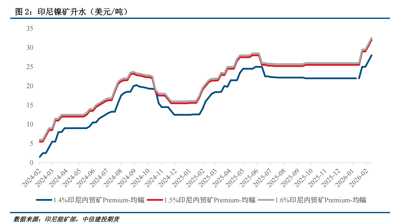 市场对配额存在预期差,我们预计本次消息扰动后,市场对矿端供应的担忧将有所缓解。但从节奏上看,印尼计划在7月受理并通过RKAB变更申请,这意味着26H1印尼镍矿供应偏紧的现状可能持续,目前印尼镍矿升水已高达28至32.5美元/吨。其中,我们预计26Q2供应矛盾将尤为突出,主要由于26Q1处于RKAB政策过渡期,企业可使用过往年份已获批配额的1/4,而Q2起企业必须使用“新配额”,但一季度末恰逢印尼斋月,政府配额审批效率或将放缓。对于26H2,市场将更加关注补充配额的落地情况。参考2024年类似行情,我们提示可重点关注PT Weda Bay Nickel(WBN)的审批进展。