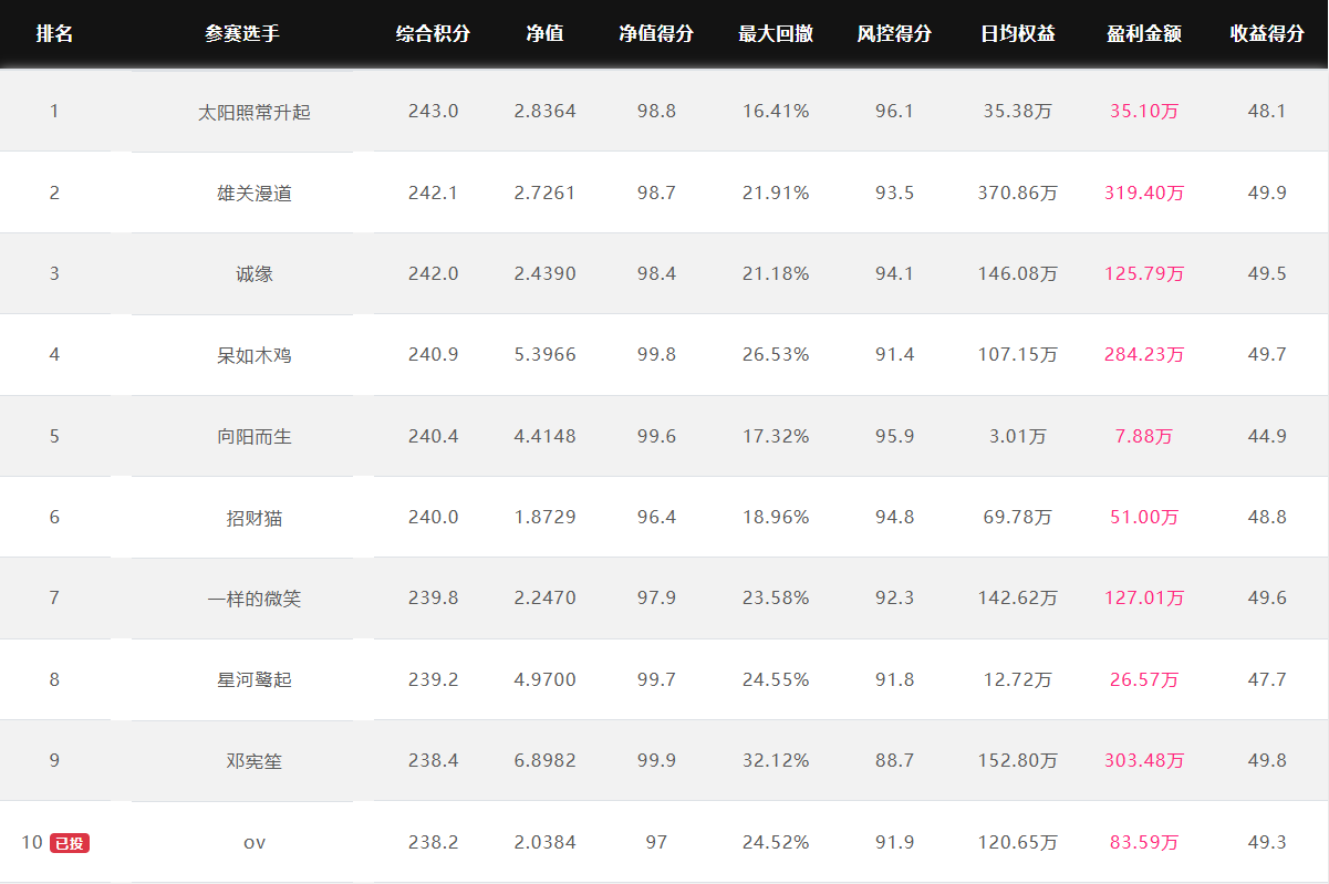 奖金上不封顶 特定期货公司参赛奖金翻倍 优秀选投 每周选优秀选手对接资金 达标必投 单笔最多给1个亿管理型资金 管理型资金盈利分成20%~70% 免费培训/研报/调研/咨询 诚邀您参赛! 为了促进国内期货市场交易人才的发展和成熟,七禾网举办本次“期货CTA英雄联盟”实盘大赛&超级服务,招募优秀的操盘手,为优秀的交易人才搭建桥梁! 第四届大赛圆满结束,第五届荣耀开启,欢迎参赛!第五届大赛已于2025年7月1日开赛,火热报名中,比赛过程中持续接受报名,大赛奖金&管理型资金&超级服务,等你来领! 2023年2月16日后,在主办方指定的几家期货公司中的某一家C公司新开户参赛,享奖金翻倍! 在主办方指定的几家期货公司中的某一家B公司新开户参赛,享奖金翻倍! 大赛中的优秀选手,只要在大赛中有3个月及以上的实盘业绩,主办方将每周发送优秀参赛者的业绩、资料给合作的数十家资方,供其考察是否投管理型资金。至2022年8月12日,资方已选出23名优秀投顾,累计投入超5.5亿元管理型资金。 优秀选投:通过主办方及资方考核后,将获得管理型资金(资金来源:七禾网自有资金(买优秀选手的基金产品)、七禾网股东、数十家合作资方) 在主办方指定的几家期货公司中的某一家B公司新开户参赛,以及2023年2月16日后,在主办方指定的几家期货公司中的某一家C公司新开户参赛,可以按照:“达标必投”进行考核(将给予单笔100万元~1亿元的管理型资金,分红比例20%~70%),详细规则请联系微信:15858201632 大赛综合排名前10名 2026.3.4