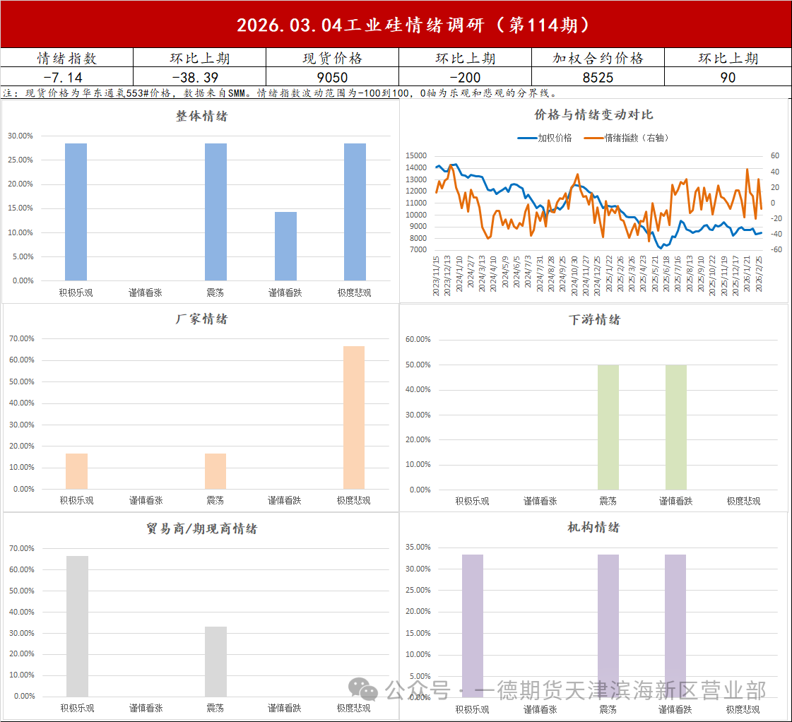 | 报告品种:工业硅 原文链接:https://mp.weixin.qq.com/s/fGl0bSbAL6OPRgm5zzJ5tg 根据样本统计,本期情绪指数为-7.14,较上期大幅回落-38.39,且重回0轴以下,本期样本参与者对未来一周的情绪转向震荡偏弱。近期走势来看,期现价格均有下跌,今日盘面上涨主要受消息扰动,资金观望有撤离。整体来看,基本面格局短期难有大变化,价格处于低位运行,难有趋势性行情。