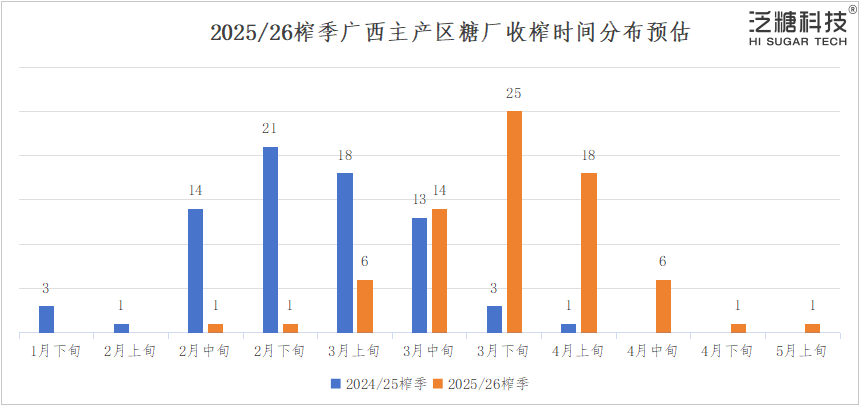 | 报告品种:白糖 原文链接:https://mp.weixin.qq.com/s/YsCSS9zT9cUmVC4dBAODQQ 2025/26榨季生产期间,广西甘蔗主产区以晴好天气为主,糖厂压榨进程整体顺畅,多数满负荷运转。截至3月初,广西仅少数糖厂收榨,进度较往年大幅延迟引发关注。为更准确地评估广西2025/26榨季甘蔗入榨量及食糖产量,泛糖产业研究开展线上调研,跟踪糖厂收榨计划,具体情况总结如下: 一、收榨进度:3月中下旬集中收榨 截至3月3日,广西2025/26榨季累计收榨糖厂3家,同比减少44家;已收榨糖厂产能1.4万吨,同比减少39.05万吨。首家收榨糖厂停榨时间同比延迟20天,开机时长增加3天。 据调研数据,当前广西糖厂甘蔗砍收进度整体区间为75%~95%,多数糖厂砍收进度约80%。 结合调研情况分析,2025/26榨季全区糖厂集中收榨时间为3月中下旬,最晚收榨时间预计为5月上旬。具体来看,预计至3月末,将有47家糖厂收榨,占开榨糖厂总数的六成左右,较上年同期减少26家。4月上旬收榨糖厂18家,中下旬收榨糖厂7家,合计25家,占比约34%,较上年同期增加24家。5月份预计有1家糖厂收榨。