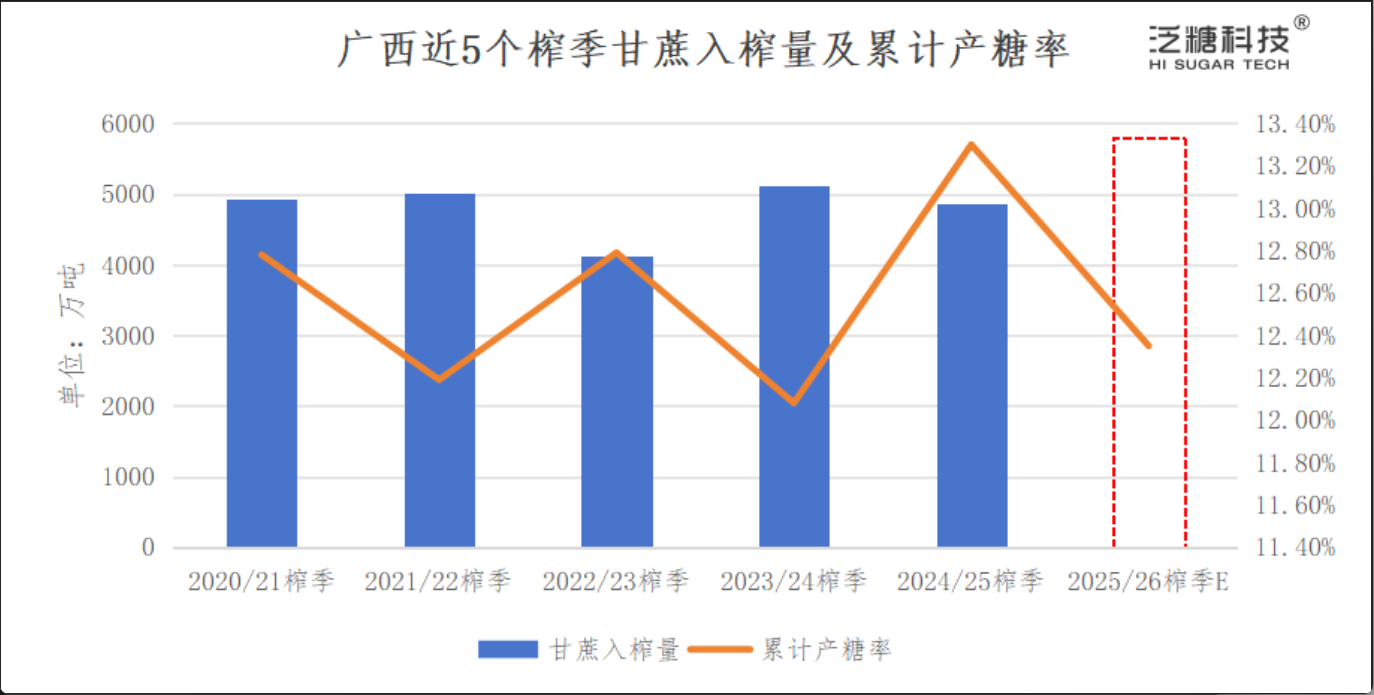 数据来源:data.hisugar 2025/26榨季广西糖厂收榨时间延迟的主要原因:一是开榨时间普遍延后2~3周;二是甘蔗增产幅度超出预期;三是春节假期影响叠加部分时段阴雨天气影响砍收。多数糖厂预计开机时长将出现不同程度增加,增幅多为10~20天。 二、甘蔗增幅超预期,产糖量调增至710~720万吨区间 受种蔗面积增加、降雨充沛的有利天气及田间管理改善等因素影响,广西甘蔗单产及入榨量同步恢复性增长。据调研信息,全区多数制糖集团认为甘蔗入榨量超出榨季初期评估。由此,我们上调2025/26榨季广西甘蔗入榨量区间至5750~5850万吨(较上期上修215~250万吨),小幅调整产糖率至12.3%~12.4%(较上期下修0.1%),食糖总产量调整至710~722万吨(较上期上修22~30万吨)。
