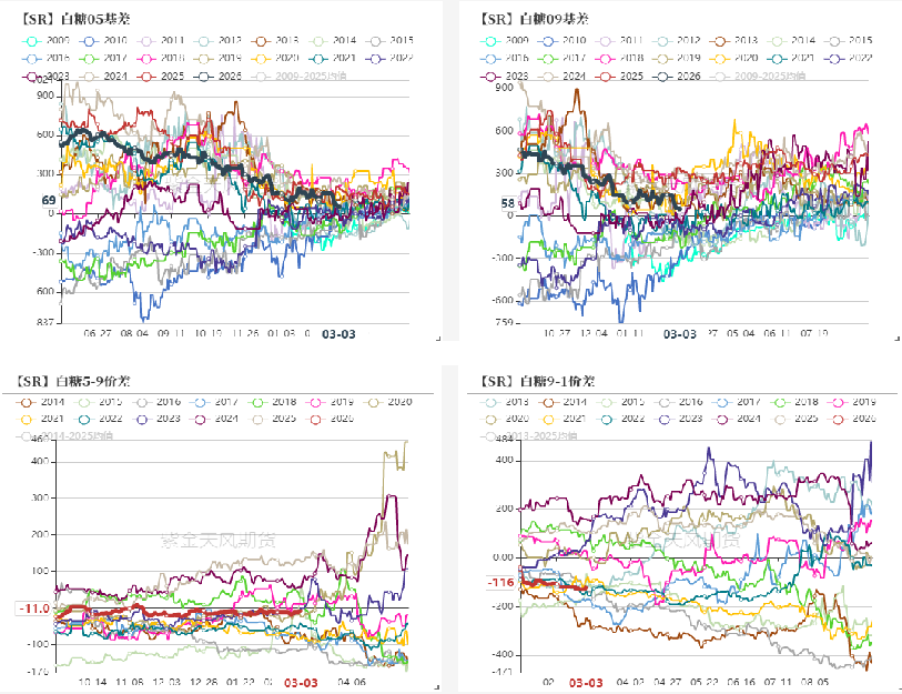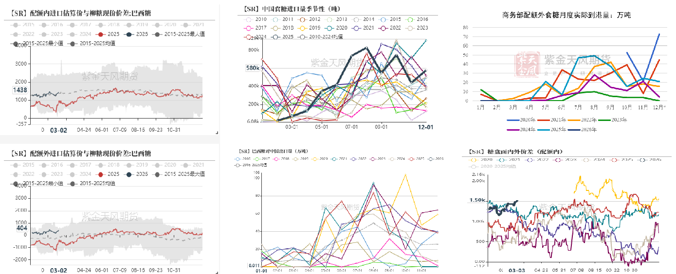 数据来源:泛糖科技,wind,紫金天风期货 价差稳定,更多机会在单边 基差随盘面上涨收敛。 月差方面,暂时没有明显的趋势。 从单边的角度看,全球丰产周期,但是巴西定产后边际略不及预期。印度产糖同比增速放缓,需要观察落地产量是否也不及预期。 当前的美以伊战争,对能源的拉动非常剧烈,可能会通过乙醇价格传导,给予糖价强支撑。考虑到巴西已经基本收榨,对制糖比影响不大,印度可能会增加糖转乙醇的用量。 对于郑糖来说,虽然实际驱动有限,但是在政策托市意图下,现货下方空间也较小,利好远月合约。