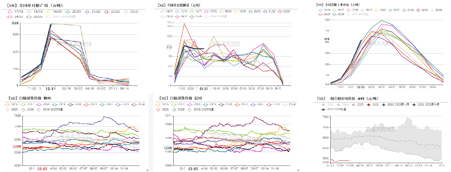 数据来源:泛糖,紫金天风期货 国内:年后盘面强势 现货销售弱于同期水平 截至1月底,2025/26年制糖期全国共生产食糖689万吨。全国累计销售食糖270万吨,其中,广西、云南、广东分别累计销糖155.1万吨、53.2万吨、20.6万吨,同比分别下降34.9%、17.7%和28.9%。 一般春节后为消费淡季。但是春节后盘面偏强,反而带动了现货价格在当前小幅走高,在买涨不买跌的心态影响下,走货尚可。