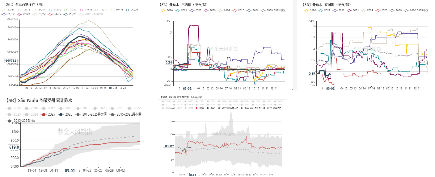 数据来源:泛糖科技,紫金天风期货 海外:当前高产导致过剩的预期不变,关注4月巴西开榨 当前巴西库存去库进程偏快。由于冬季受到拉尼娜的影响,圣保罗累积降水偏低,关注2026年3-4月天气转向厄尔尼诺的节奏。 印度的产量还没有完全确定,其中也存在产量不及预期的不确定性,需要继续关注。