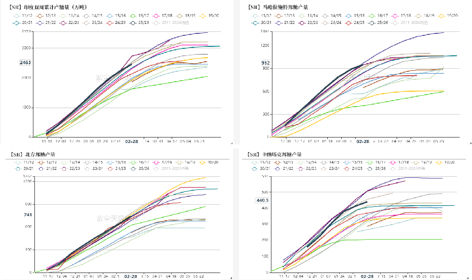 数据来源:巴西海关,路透,紫金天风期货 印度:产糖进程同比增速放缓 根据NFCSF的数据,截至2026年2月28日,印度累计产糖2463万吨,同比增加262.5万吨;平均出糖率为9.44%,同比提高0.13%。印度产糖进程同比增速放缓,对糖价存在一定支撑,继续观察为主。