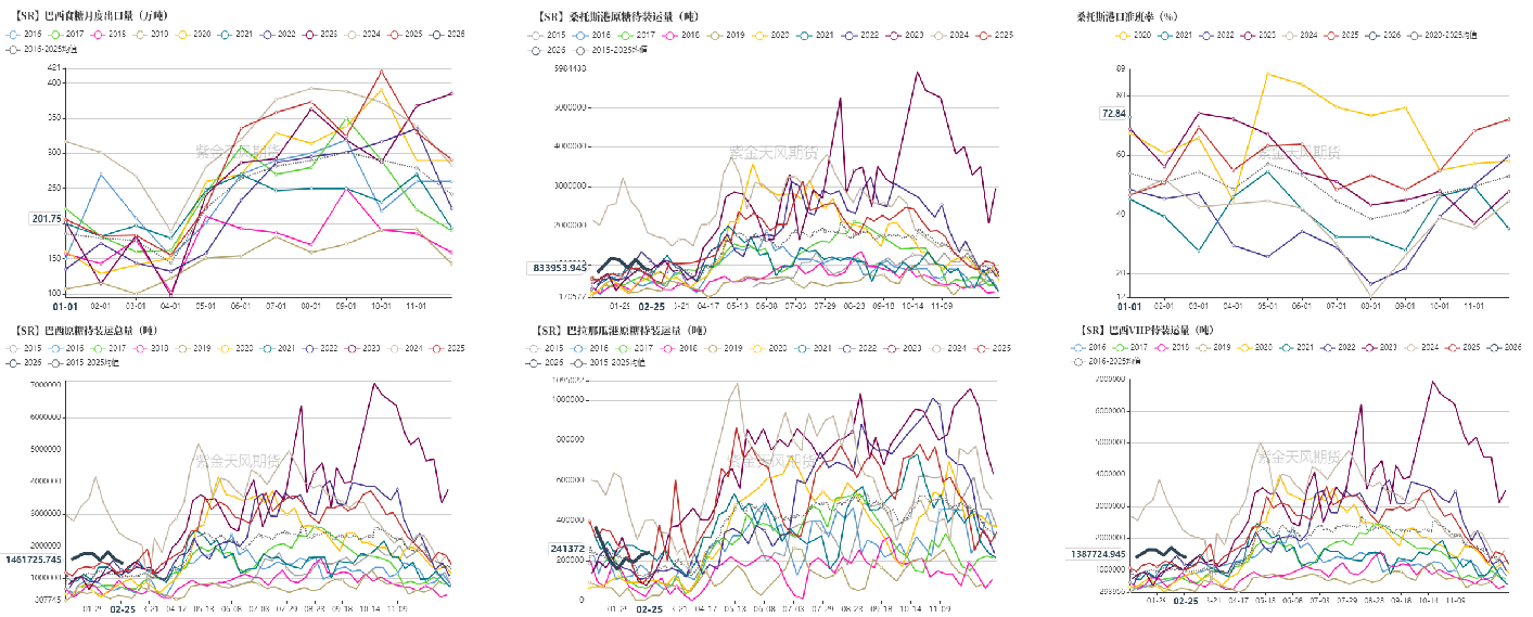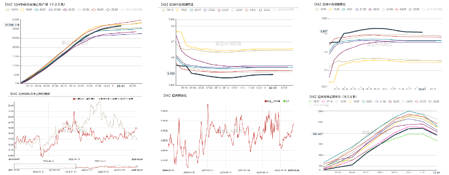 数据来源:UNICA, 紫金天风期货 巴西:定产略少于预期巴西:开榨接近尾声 1月下半月,巴西中南部地区甘蔗入榨量为60.9万吨,同比增幅154.39%;甘蔗ATR为121.18kg/吨,较去年同期的136.25kg/吨减少15.07kg/吨;制糖比为6.63%,较去年同期的23.57%减少16.94%;产糖量为0.5万吨,较去年同期的0.7万吨减少0.2万吨,同比降幅达36.31%。 2025/26榨季截至1月下半月,巴西中南部地区累计入榨量为60164.4万吨,同比降幅达2.16%;甘蔗ATR为138.34kg/吨,较去年同期的141.45kg/吨减少3.11kg/吨;累计制糖比为50.74%,较去年同期的48.14%增加2.6%;累计产糖量为4024万吨,较去年同期的3989.9万吨增加34.1万吨,同比增幅达0.86%。 产糖尾声,预计最终产量在4030万吨附近,在高制糖比之下,受ATR偏低影响,产量略低于预期。