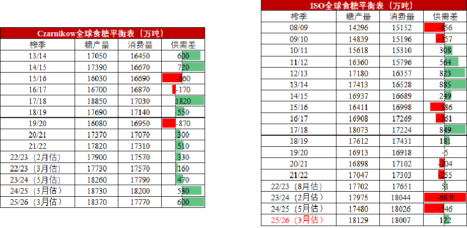 | 国际:各机构下调25/26过剩预期 全球:各机构调低25/26榨季过剩预期 2月27日,国际糖业组织(ISO)最新预测显示,因印度和泰国产糖量低于预期,预计2025/26榨季全球食糖产量预计为1.8129亿吨,较此前下调48万吨;预计2025/26榨季全球食糖消费量为1.8007亿吨,较此前下调7万吨;预计2025/26榨季全球糖市供应过剩量为122万吨,较此前预测的163万吨下调41万吨。 Czarnikow预计2025/26榨季全球食糖市场供应过剩670万吨,较上次预估下调70万吨。报告中还指出,若预期的厄尔尼诺天气现象强度较大,过多降雨或导致全球最大糖生产国巴西的收成面临困难。 Green Pool近日发布报告,预计2026/27榨季全球糖市将连续第二年出现过剩,食糖供应过剩量将降至15.6万吨,低于2025/26榨季的274万吨,主要原因是食糖产量下降。