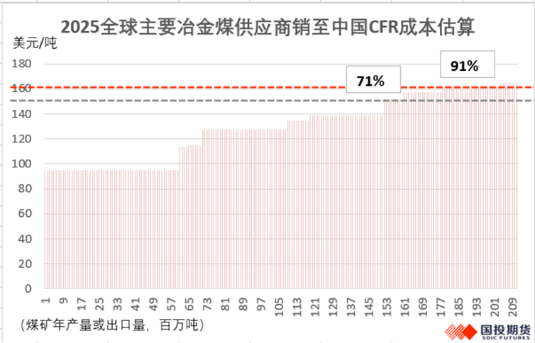 我们结合各家煤矿年报的计划内容,再叠加对蒙古煤出口增量的估计,综合预测2026年全球主要冶金煤供应商的年度供应量有潜力增加约1550万吨的规模,其中将有1000万吨的供应增量依然由蒙古国提供。其他约550万吨的增量规模将主要来自于某澳洲新矿按计划投产以及停产的莫伦巴北和利尔南煤矿的尝试复产,再叠加美国煤矿受到制造业提振所带动的进一步提产,但也已减去上半年Saraji South的维护影响预计量。 二、海运成本或导致海运冶金煤成本曲线进一步上移 结合各家海外煤矿企业的年报信息,我们整理出了2025年供应量(产量或出口量)达到2.1亿吨冶金煤市场的供应成本分布情况。但需要注意的是,虽然大部分吨煤FOB成本都是煤矿企业自身公布的数值,但由于其公布的都是综合煤矿成本,可能存在炼焦煤和喷吹煤、动力煤混合估算的情况(我们已经尽量进行剥离估算)。一小部分煤矿成本是由我们自己结合营收、净利润和产量来进行估算的结果。此外,我们在FOB的基础上,加上了理论税费和运至中国的海运费成本,从而近似估算出CFR的成本状态,最终估算结果如下图。