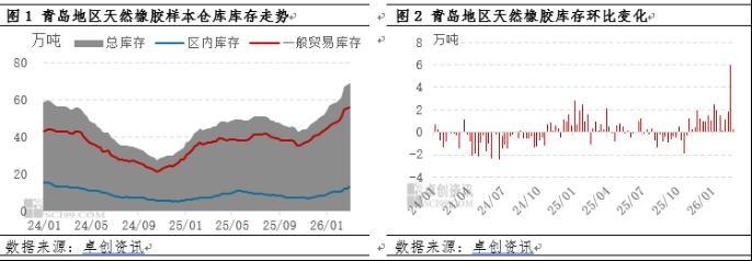 | 【导语】供需双降,但供大于求,截至2月底青岛地区天然橡胶样本仓库库存68.65万吨,较1月底增加9.53万吨,增幅16.12%。3月供需双增,但或呈现供大于求格局,预计3月份青岛地区天然橡胶库存去库压力比较大,或延续累库趋势,库存维持高位可能性较大。 2月份青岛地区天然橡胶库存累库 据卓创资讯统计,截至2月底青岛地区天然橡胶样本仓库库存68.65万吨,较1月底增加9.53万吨,增幅16.12%,累库速度加快(上期增幅13.82%)。其中,保税区内库存12.95万吨,较1月底增加2.38万吨,增幅22.52%;一般贸易库存55.7万吨,较1月底增加7.15万吨,增幅14.73%。天然橡胶到港量减少,但同时下游受春节影响集中放假导致需求下滑更为明显,因此供大于求,青岛地区天然橡胶库存继续累库。