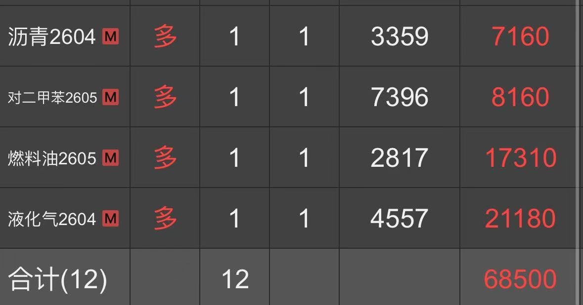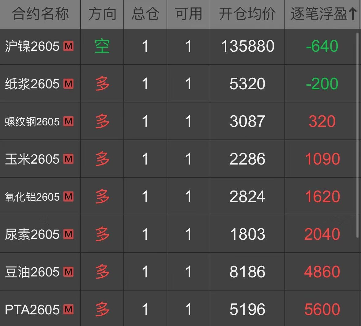 | 一、开仓总结 燃料油:2026年1月9日,达到启动点的开仓条件,所以在14:56开多一手燃料油2603合约,开仓价为2514。燃料油2603合约于2026年2月5日21:35移仓至主力合约2605,开仓价为2817。 PTA:2026年2月10日,达到启动点的开仓条件,所以在14:53开多一手PTA2605合约,开仓价为5230。 玉米:2026年2月10日,达到启动点的开仓条件,所以在14:53开多一手玉米2605合约,开仓价为2286。 尿素:2026年2月11日,达到启动点的开仓条件,所以在14:42开多一手尿素2605合约,开仓价为1803。 沥青:2026年2月25日,达到启动点的开仓条件,所以在14:50开多一手沥青2604合约,开仓价为3359。 豆油:2026年2月26日,达到启动点的开仓条件,所以在14:45开多一手豆油2605合约,开仓价为8186。 液化气:2026年2月26日,达到启动点的开仓条件,所以在14:45开多一手液化气2604合约,开仓价为4557。 对二甲苯:2026年2月27日,达到启动点的开仓条件,所以在14:53开多一手对二甲苯2605合约,开仓价为7396。 沪镍:2026年3月5日,达到启动点的开仓条件,所以在14:53开空一手沪镍2605合约,开仓价为135880。 氧化铝:2026年3月6日,达到启动点的开仓条件,所以在14:46开多一手氧化铝2605合约,开仓价为2824。 螺纹钢:2026年3月6日,达到启动点的开仓条件,所以在14:47开多一手螺纹钢2605合约,开仓价为3087。 纸浆:2026年3月6日,达到启动点的开仓条件,所以在14:50开多一手纸浆2605合约,开仓价为5320。 二、平仓计划 燃料油:达到启动点的平仓止损/止盈条件,在收盘前或下一个交易日开盘后全部平仓。 PTA:达到启动点的平仓止损/止盈条件,在收盘前或下一个交易日开盘后全部平仓。 玉米:达到启动点的平仓止损/止盈条件,在收盘前或下一个交易日开盘后全部平仓。 尿素:达到启动点的平仓止损/止盈条件,在收盘前或下一个交易日开盘后全部平仓。 沥青:达到启动点的平仓止损/止盈条件,在收盘前或下一个交易日开盘后全部平仓。 豆油:达到启动点的平仓止损/止盈条件,在收盘前或下一个交易日开盘后全部平仓。 液化气:达到启动点的平仓止损/止盈条件,在收盘前或下一个交易日开盘后全部平仓。 对二甲苯:达到启动点的平仓止损/止盈条件,在收盘前或下一个交易日开盘后全部平仓。 沪镍:达到启动点的平仓止损/止盈条件,在收盘前或下一个交易日开盘后全部平仓。 氧化铝:达到启动点的平仓止损/止盈条件,在收盘前或下一个交易日开盘后全部平仓。 螺纹钢:达到启动点的平仓止损/止盈条件,在收盘前或下一个交易日开盘后全部平仓。 纸浆:达到启动点的平仓止损/止盈条件,在收盘前或下一个交易日开盘后全部平仓。 注:本交易总结由第三方提供,只作为投资理念和方法的交流,不作为七禾网的观点,也不作为投资参考和建议。 附: 1、交易者简介 十年股票/期货/外盘交易经验,每年都实现投资盈利。 擅长微观盘面分析和宏观市场分析,总结了数套有效的盈利模式,和众多高手有深入交流,收益良好。 2、持仓截图