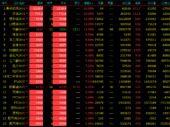 | 2026年3月9日,国内期货主力合约涨多跌少,集运欧线、SC原油、燃料油、低硫燃料油(LU)、纯苯、苯乙烯、沥青、BR橡胶、液化气、乙二醇、瓶片、短纤、PX0>对二甲苯、PTA、丙烯、PVC、塑料、聚丙烯封涨停,甲醇涨超11%,棕榈油涨超6%,烧碱、焦煤涨超5%。跌幅方面,沪锡、钯跌超2%。