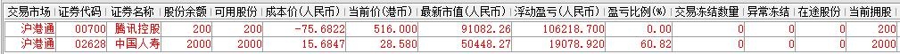 | 账户初始资金:100000.00元 2015年5月18日入金:32000.00元 2015年5月29日入金:9000.00元 2015年6月23日入金:20000.00元 2015年6月26日入金:10000.00元 2015年6月29日入金:20000.00元 2015年7月3日入金:20000.00元 2015年7月8日入金:10000.00元 2016年1月12日入金:90000.00元 2016年1月22日入金:100000.00元 2016年1月27日入金:100000.00元 2016年3月21日出金:270000.00元 2016年4月12日出金:35639.23元 2016年0月10日出金:56913.08元 2016年10月28日入金:60000.00元 2017年3月7日出金:113800.00元 参考市值:163206.53元 账户资产:163608.99元 截至今日账户A股盈亏:40943.36元 截至今日账户港股盈亏:120230.19元 账户净值:1.831 资金股份