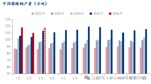 | 报告品种:铜 原文链接:https://mp.weixin.qq.com/s/ZgbZ9SDwhZGxtzhhMAMefw Mysteel调研国内60家电解铜生产企业,涉及精炼产能1698万吨(含2026年新增产能)样本覆盖率99.41%得出:2026年2月国内电解铜实际产量109.99 万吨,环比减少6.91%,同比增加5.63%。1-2月国内电解铜产量累计为228.15万吨,同比增加8.69%。 另据调研企业的生产计划安排来看,2026年3月国内电解铜预计产量117.38万吨,环比增加6.72%,同比增加3.9%。1-3月国内电解铜预计产量累计为345.53万吨,同比增加7.01%。