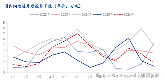 数据来源:Mysteel 2月份国内电解铜产量环比减少,主因2月处于国内春节假期,部分冶炼厂因控制产量而有一定减少,同时2月生产天数少几天也对产量有较大的影响;铜原料依旧制约冶炼厂的生产,铜精矿价格TC依旧处于绝对低位,且另一铜原料再生铜的补充也下滑明显,据Mysteel调研国内再生铜阳极样本企业2月国内再生铜阳极样本企业实际产量为4.03万吨,环比减少7.75万吨,降幅65.79%,同比减少3.56万吨,降幅46.9%;另外据Mysteel调研2月份检修少,仅有2家企业检修,影响较为有限。 3月电解铜产量或将明显回升,多数冶炼企业回归正常生产,且3月检修企业依旧较少,少数企业检修对产量影响有限,影响产量1.6万吨左右,因此3月电解铜产量或将维持正常高产。不过铜原料对产量的增长依旧影响较大。