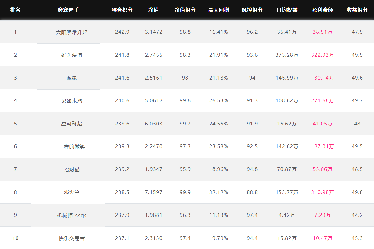 奖金上不封顶 特定期货公司参赛奖金翻倍 优秀选投 每周选优秀选手对接资金 达标必投 单笔最多给1个亿管理型资金 管理型资金盈利分成20%~70% 免费培训/研报/调研/咨询 诚邀您参赛! 为了促进国内期货市场交易人才的发展和成熟,七禾网举办本次“期货CTA英雄联盟”实盘大赛&超级服务,招募优秀的操盘手,为优秀的交易人才搭建桥梁! 第四届大赛圆满结束,第五届荣耀开启,欢迎参赛!第五届大赛已于2025年7月1日开赛,火热报名中,比赛过程中持续接受报名,大赛奖金&管理型资金&超级服务,等你来领! 2023年2月16日后,在主办方指定的几家期货公司中的某一家C公司新开户参赛,享奖金翻倍! 在主办方指定的几家期货公司中的某一家B公司新开户参赛,享奖金翻倍! 大赛中的优秀选手,只要在大赛中有3个月及以上的实盘业绩,主办方将每周发送优秀参赛者的业绩、资料给合作的数十家资方,供其考察是否投管理型资金。至2022年8月12日,资方已选出23名优秀投顾,累计投入超5.5亿元管理型资金。 优秀选投:通过主办方及资方考核后,将获得管理型资金(资金来源:七禾网自有资金(买优秀选手的基金产品)、七禾网股东、数十家合作资方) 在主办方指定的几家期货公司中的某一家B公司新开户参赛,以及2023年2月16日后,在主办方指定的几家期货公司中的某一家C公司新开户参赛,可以按照:“达标必投”进行考核(将给予单笔100万元~1亿元的管理型资金,分红比例20%~70%),详细规则请联系微信:15858201632 大赛综合排名前10名 2026.3.9