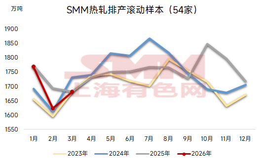 本月,SMM样本扩充后的54家钢厂热轧商品材计划量总计1680.15万吨,较上月实际产量上升3.7%。 日均来看,3月天数较2月多3天,3月54家钢厂热轧商品材日均排产为54.20万吨,环比上月实际日均产量下降6.3%。 图3:SMM钢厂热轧商品材计划量(滚动样本)