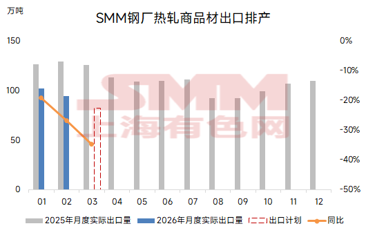 数据来源:SMM 3月,东北、华北、华东及华中多家钢厂发布检修计划,叠加两会期间华北部分钢厂自发减产、降负荷;此外,SMM了解到少量钢厂生产调节至冷系,综合影响下,本月钢厂总排产较2月仅窄幅波动,日均排产较2月降幅明显。 分内外贸看 内贸:本月热轧板卷内贸排产1222.25万吨,环比上月国内实际产量增加30.68万吨,增幅2.6%,日均内贸排产环比降7.4%。据SMM调研,3月钢厂接单压力对比2月有所上升。 外贸:本月热轧板卷出口计划量81.9万吨,较上月实际出口下降12.5万吨,环比降幅13.2%。 本月国内钢厂热轧出口计划量环比小幅下降,区域情况来看,东北、华北钢厂3月出口排产环比回落,部分大厂调整产品结构,将部分出口计划量调整至冷系产品;中东部及华南钢厂出口计划量基本维稳。 新订单方面,据SMM最新调研了解,受伊朗地缘冲突影响,现多数贸易商保持观望,暂停对中东地区的报价;而部分国内出口商可以承接部分原本流向伊朗的订单,近期其他市场询盘有所好转,尤其是东南亚市场。 图4:SMM钢厂热轧出口计划量与实际出口
