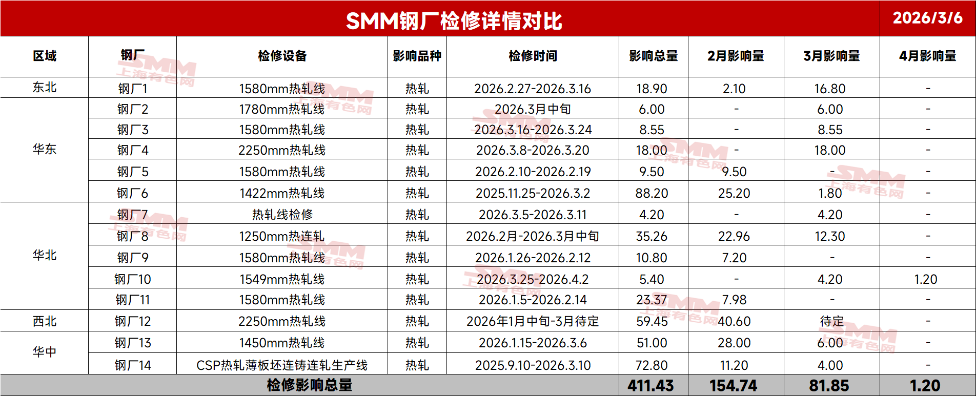 数据来源:SMM 检修方面 3月热轧检修影响量暂为81.85万吨,环比上月下降72.89万吨。目前发布的检修集中于东北、华北、华东及中部区域,后续情况SMM将持续跟踪,具体检修明细见下表: 表2:SMM钢厂热轧检修