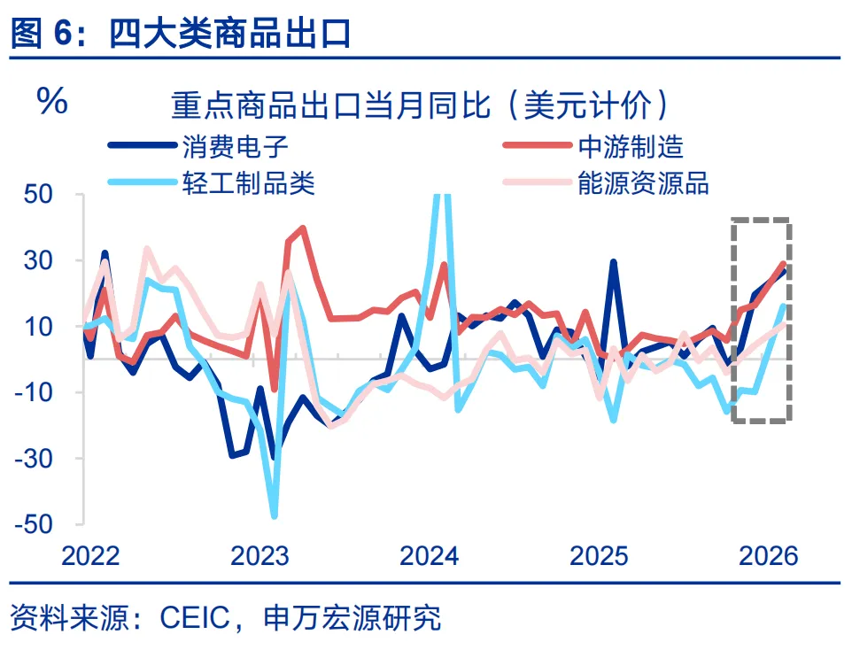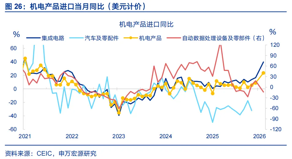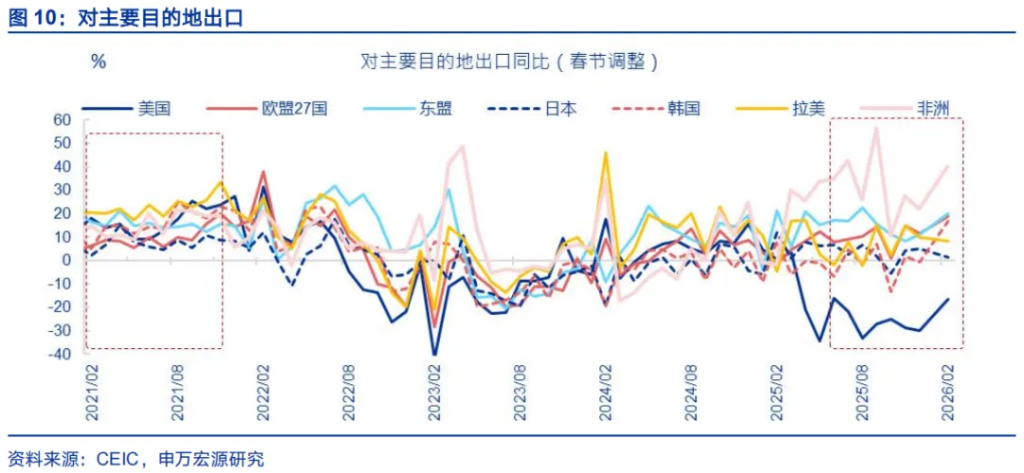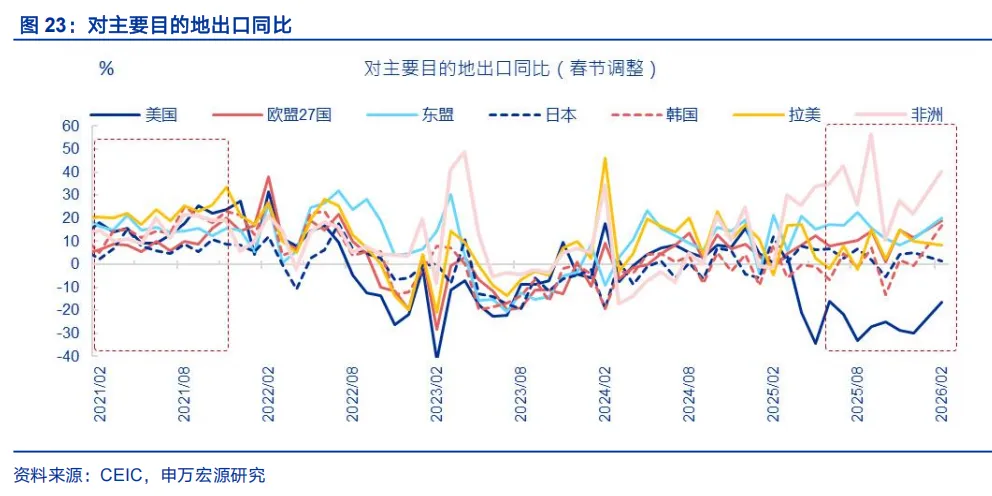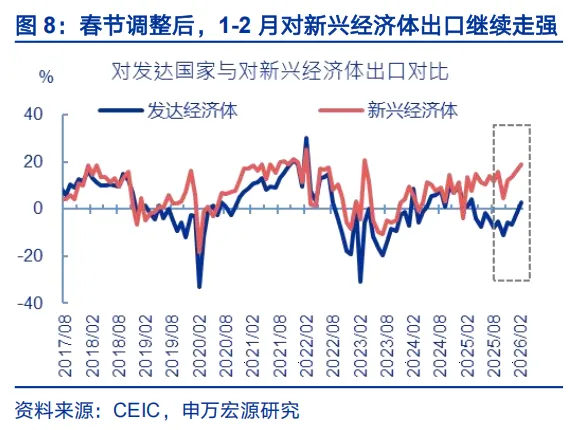 从国别结构看,美国需求改善、新兴需求提速仍是支撑出口的两大关键逻辑。基于春节调整后数据,发达经济体方面,对美国出口(回升13.4百分点至-16.7%)明显反弹。我们持续强调,当前美国剔除特殊商品扰动后的真实进口,持续弱于美国消费需求,这意味着美国有持续的增加进口动机,关税形势缓和也有利于强化这一逻辑;对欧盟出口反弹幅度为7.5个百分点;新兴经济体方面,对非洲(回升18.3百分点至40.1%)、对东盟(回升9.2百分点至20.3%)出口明显走强,与新兴经济体工业化提速、内需释放有直接关系,背后反映新兴经济体政策扩张、FDI加速流入、人口红利释放等逻辑的驱动。