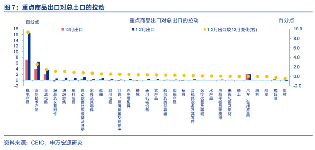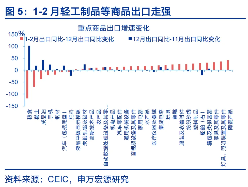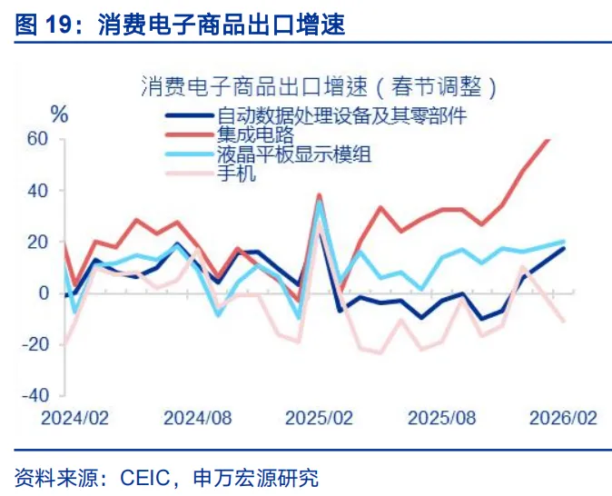从商品结构看,出口反弹幅度较大的也是受“春节错位”影响较明显的劳动密集型行业,部分中间品资本品出口改善则或反映新兴需求改善影响。春节错位对所有行业出口均有影响,但不同行业影响幅度不同。出口反弹幅度较大的商品有两大类,一是轻工制品,譬如服装(回升24.6百分点至14.4%,下同)、纺织纱线(回升24.6个百分点至20.4%)、塑料(回升27.3个百分点至24.8%)、家具、灯具等。上述行业主要集中于劳动密集型行业,受春节停工、复工影响更直接,因而更受益于“春节错位”带来的出口高增,同时上述商品也是对美出口占比较高的领域,或与美国进口需求回升、关税形势缓和有关;二是部分中间品和资本品,譬如集成电路(回升19.9个百分点至67.6%)、自动数据处理设备及零部件(回升11.4个百分点至17.4%)、船舶、汽车零部件等,与新兴经济体工业化提速、加大生产资料进口有关。