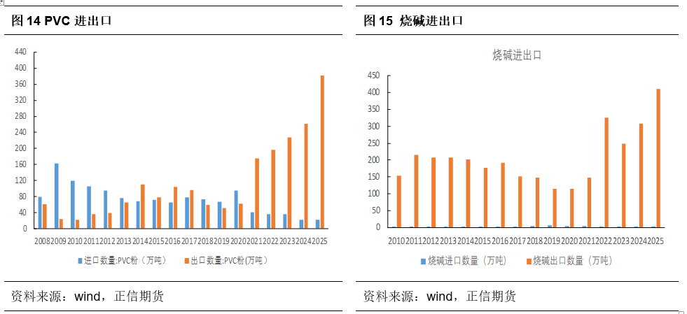 三、需求端:国内需求仍承压,出口存改善预期 PVC国内下游终端需求中,房地产行业占比近60%,一般竣工端决定PVC当下需求,新开工决定未来需求预期,近几年新开工的持续走弱,房地产行业仍在调整阶段,改善尚需时间。内需疲软仍是PVC当前基本面的薄弱环节,虽近期有部分投机需求,但终端企业多以刚需补库为主,下游追涨积极性或将走弱,内需对价格的支撑作用一般。 烧碱国内需求端整体呈现“主力需求承压、非铝需求稳健、增量不及预期”的特征,难以有效消化供应增量,氧化铝年内新投与减产预期并存,新产能的备货需求中部分在已经兑现,同时新产能落地将加剧供应过剩风险,若氧化铝价格持续承压导致投产进度放缓或开工率不及预期,烧碱需求增量将面临下修风险,年内氧化铝对烧碱的需求支撑同比削弱,从氧化铝和烧碱价格相关性来看,烧碱价格的持续性上涨驱动更多是在氧化铝价格上涨阶段,今年市场对烧碱需求预期或已从增量驱动转向刚需维稳,缺乏强劲的上涨动力。非铝需求稳健增长,但难以对冲氧化铝需求疲软,仅能在阶段性复工复产阶段带来短期提振。 此次中东事件对氯碱出口存在一定利好。近日市场传闻海外(印尼、韩国)氯碱联产装置集中降负消息,主要在于成本端影响,而此次中东地缘冲突或导致原料运输受阻、成本抬升,加剧海外减产预期,国内氯碱出口接单近期均有所好转。对于烧碱而言,海外减产消息仍会刺激,2026年出口仍将保持增长态势,但增速预计放缓,烧碱出口数量在我国供需中占比不高,对国内供应的缓解作用有限。对于PVC而言,年初因取消PVC出口退税消息政策影响,引发了一场“抢出口”行情,导致1-2月PVC出口签单量升至近年高位,3月受中东地缘政治影响,部分海外PVC装置后续有降负荷的可能,PVC电石法后续生产或相对稳定,所虽临近出口退税取消节点,但海外需求方采购意向仍然较强,3月PVC出口接单有望进一步改善,出口的短期放量缓解了国内市场的供应压力,为价格反弹提供了重要支撑。如果中东地缘政治影响持续时间较长,海外对PVC价格接受程度可能进一步提升,届时大陆PVC出口接单情况或依旧维持较高水平。