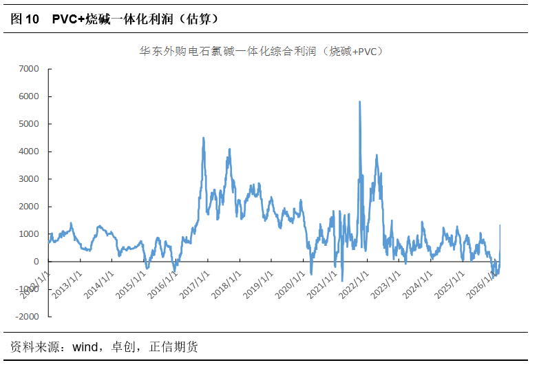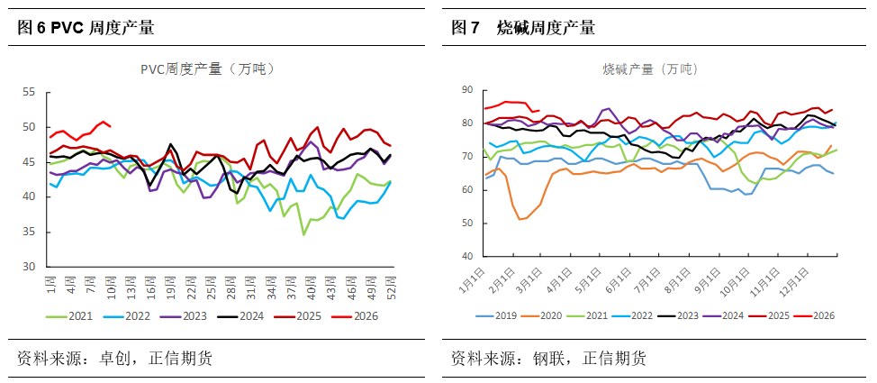 二、供应端:开工维持高位,货源较为充足 供应端是氯碱基本面的压制因素之一,2026年PVC扩能周期趋于尾声,预计新增产能仅30万吨(浙江嘉化装置)。2026年烧碱行业规划新增产能超过250万吨,同比增加约5%,但实际落地产能增速3%左右,多数计划上半年投产,但放量可能在下半年。 尽管当前氯碱开工率维持相对中性,但受产能基数扩大影响,产量延续同期高位,给下游需求带来较大消化压力,对于目前多数化工品而言,核心驱动依旧在于供应端。前期由于氯碱一体化利润处于低位,市场交易未来装置降负预期,而近期现货整体反弹,利润改善明显。后续氯碱行业的开工变化,或主要是受季节性检修影响,PVC行业一般年内有两次检修,包括4-6月春检及8-10月的秋季检修,不过由于原油价格重心上移,乙烯价格持续上涨,后续国内乙烯法PVC企业也不排除出现减产现象。烧碱一般年后也有检修计划,但集中检修则多在三季度。对于供应端的驱动,后续核心是持续关注产量变化。