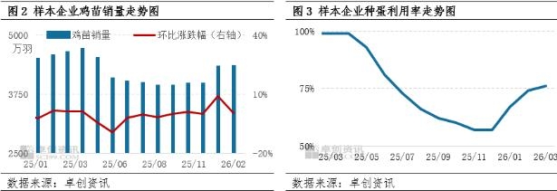 从供给端数据来看,当前种鸡企业的生产与订单情况,充分印证了市场需求的旺盛。据卓创资讯监测数据显示,1-2月份样本企业鸡苗月度销量环比增幅分别为9.17%和0.19%,销量连续增长,直观反映市场补栏积极性持续提升,鸡苗需求端表现强劲。订单层面,种鸡企业鸡苗排单顺畅,截止到3月初,种鸡企业鸡苗订单多数排至4月下旬及5月上旬,种蛋利用率多在70%-80%,接近满负荷生产状态,体现下游养殖端对后市行情的乐观预期。