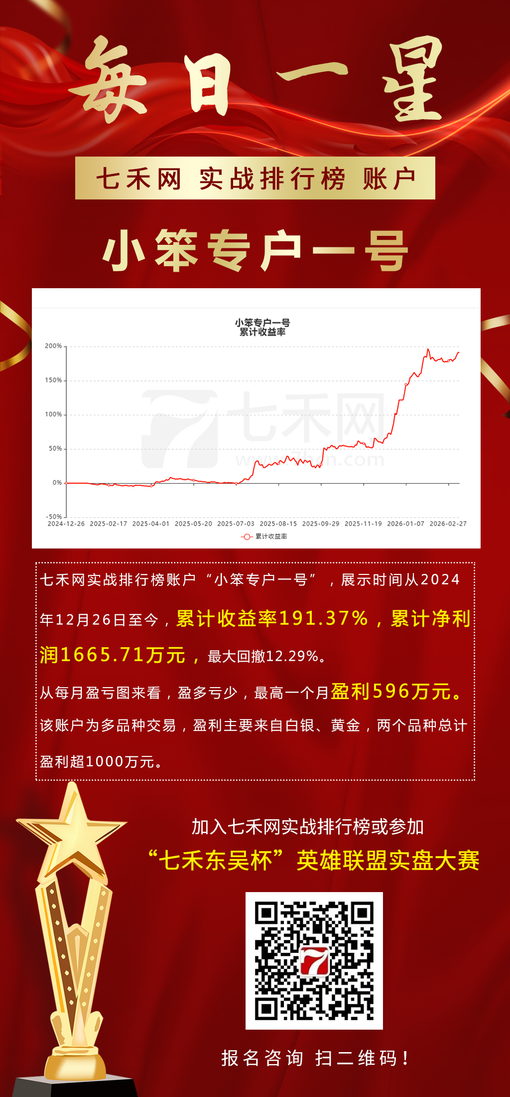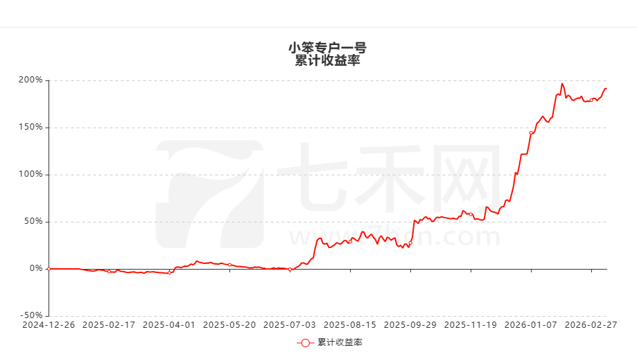 七禾网实战排行榜账户“小笨专户一号”,展示时间从2024年12月26日至今,累计收益率191.37%,累计净利润1665.71万元,最大回撤12.29%。