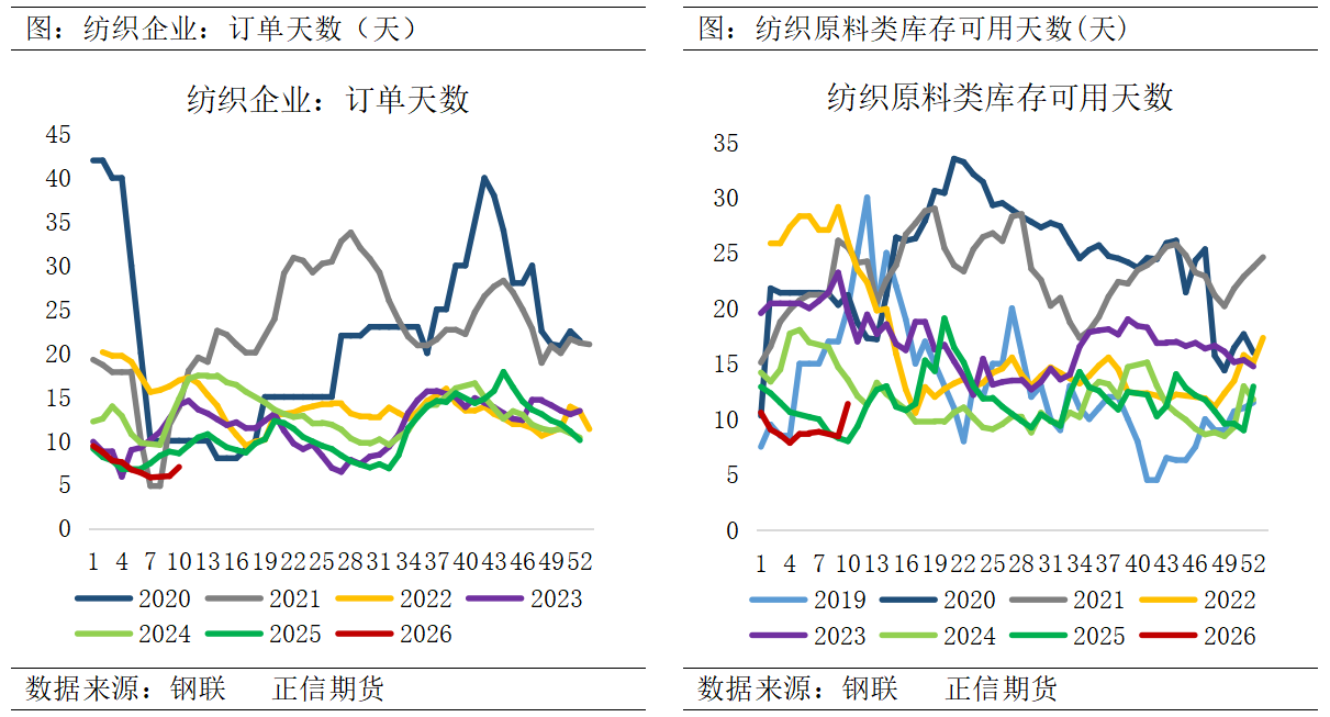 4、复工受成本掣肘,需求弱复苏与负反馈博弈 需求端,春节后聚酯及织造负荷稳步回升,原料价格的连续上涨激发了下游投机性补货需求,加速了库存去化,目前聚酯各环节库存压力可控。但仍需警惕高成本的传导阻力,若原料价格长期维持高位,将严重挤压下游利润空间,进而诱发减产等负反馈机制,制约需求的进一步释放。 截至3月5日江浙地区化纤织造综合开工率为42.36%,较上期数据+19.73%。终端织造订单天数平均水平7天,较上周+1.04天。节后织造复工受成本飙升掣肘,未备货工厂多选择延后复产,行业整体开工复苏乏力。叠加海运风险引发的海外订单下滑,需求端不确定性加剧。在成本支撑与需求疲软的激烈博弈下,参与者普遍持谨慎观望态度。当前国内外纺服库存均不高,关注下游补库存节奏,以及纺服出口订单情况。