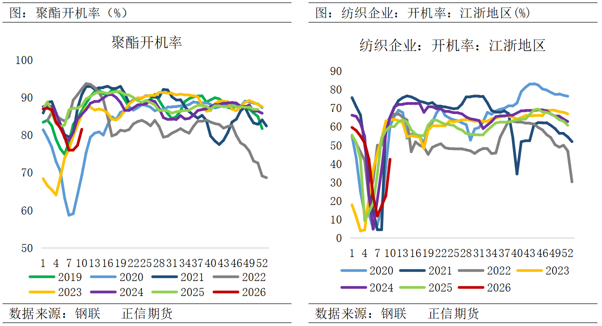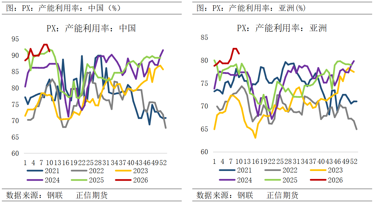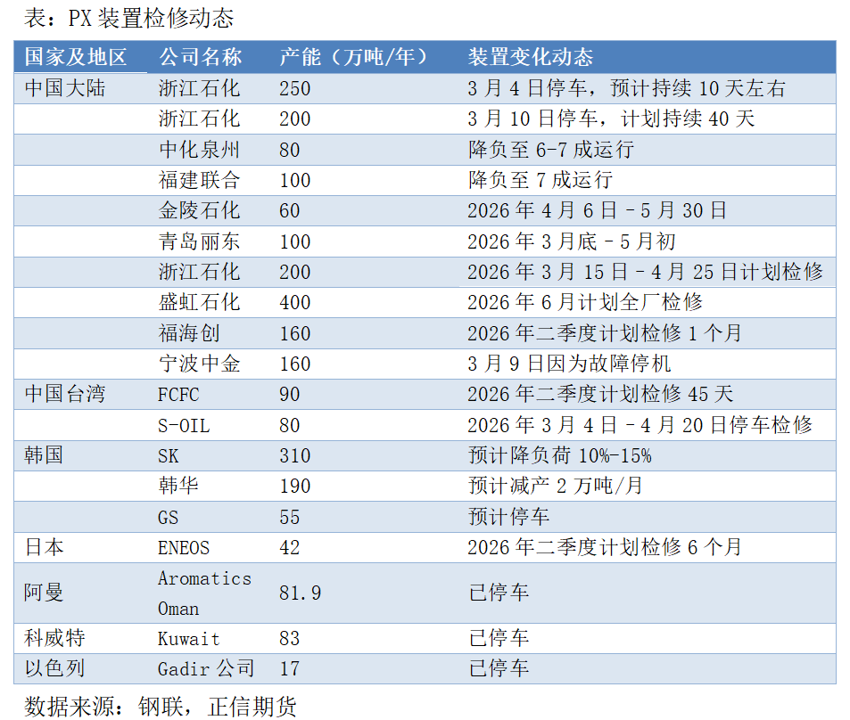 二、聚酯基本面观察 1、PX装置出现预防性停车,供应缩量预期较强 战争期间因上游原料供应稳定性担忧,国内部分PX装置进行了预防性降负措施,目前国内PX总负荷降至91.16%(产能4613万吨),后续关注中东局势特别是霍尔木兹海峡通行情况。 国内明确受到原料预备性降负,影响到PX供应的装置分别有浙石化、中化泉州、福建联合;而且除二季度集中检修安排以外,关注中石油、中石化、中海油等装置状态。受霍尔木兹海峡事件影响,韩国方面除了既定的S-oil 80万吨PX装置检修安排兑现,还有SK、韩华及GS公司PX装置存在降负运行预期;日本及中国台湾方面目前尚未公布减产计划;而中东地区多套装置,例如科威特芳烃、阿曼石油等均已停车。二季度PX供应来看,预计国产方面缩量为15-20万吨、进口量缩量10-20万吨/月,PX整体供需将呈现连续强去库格局。
