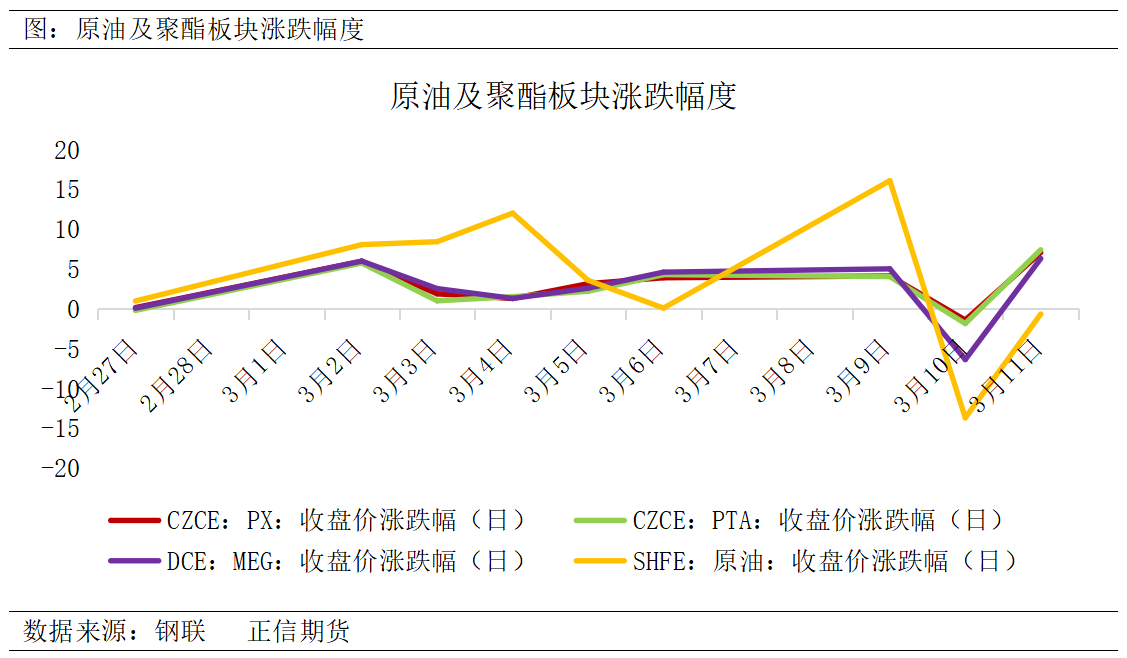 | “战争结束“言论与G7释储计划迅速挤出了油价中的地缘溢价,但霍尔木兹海峡的通行不确定性仍是悬于头顶的达摩克利斯之剑,盘面波动较大。本文将聚焦这一核心变量,剖析在地缘缓和与供应风险并存的博弈下,聚酯产业链如何从情绪驱动回归基本面逻辑。 一、行情回顾 战争发酵期(3月初至3月9日):聚酯板块经历了从“成本驱动”向“供应扰动”的逻辑深化。初期伊朗地缘冲突直接推高原油成本,带动PX、PTA及MEG普涨;随后随着霍尔木兹海峡封闭预期升温,市场交易逻辑切换至亚洲炼厂降负,导致作为芳烃核心的PX因东北亚进口受阻及炼厂开工率下降而表现较强,涨幅居前;同时,中东乙二醇出口中断及乙烯原料短缺预期也助推MEG大幅跟涨,而PTA受制于自身产能充裕,涨幅相对温和,整体呈现“原油>PX>MEG>PTA”的分化格局。 地缘缓和后(3月10日-3月11日):3月10日随着局势降温,市场迅速进入去风险溢价与估值回归阶段。原油单日暴跌引发连锁反应,聚酯链此前计入的战争溢价被快速挤出,其中前期炒作供应短缺最剧烈的MEG跌幅最深,PX因炼厂复工预期回升而回吐全部涨幅,仅PTA凭借相对稳健的基本面抗跌性稍强;尽管短期情绪退潮导致价格大幅回调,但由于中东产能受损具有持续性,聚酯板块的成本中枢抬升,3月11日聚酯板块大幅上涨,关注实际供应恢复进度与下游需求对高成本的接受程度。
