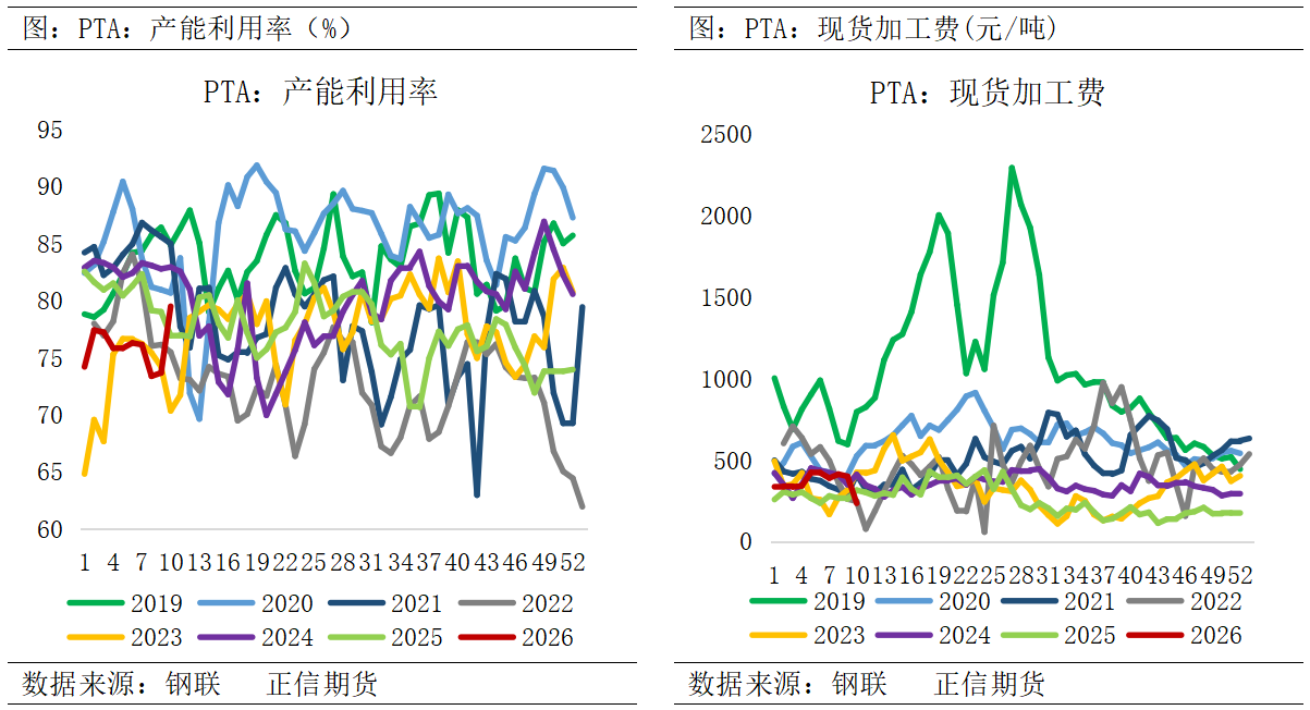 2、PTA负荷维持高位,加工费压缩 自去年四季度起,PTA加工差从不足300元/吨修复至450元/吨区间,行业盈利显著改善。尽管2月初聚酯减产促使部分PTA工厂落实检修,但2月底随着聚酯负荷快速回升,PTA供应端提负超预期。包括逸盛新材料(360万吨)满负荷运行,独山能源(250万吨)、英力士(125万吨)相继重启,福海创(450万吨)提升负荷,仪化(300万吨)停车检修,PTA整体负荷环比战前提升3.8%至80.33%。 这轮行情中上游成本端的强势传导压缩了PTA实际利润,市场担忧原料风险可能倒逼装置减停,推动基差显著走强。地缘冲突虽提前透支了PX及PTA的减产预期并强化了看涨情绪,暂时掩盖了3月PTA供大于求的基本面矛盾。后市来看,随着油价回调及下游聚酯负荷进一步回升,预计PTA利润将维持偏强格局。