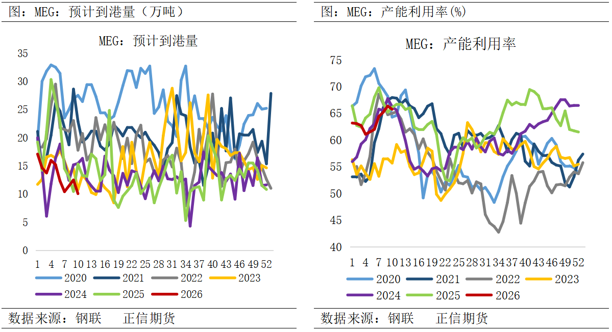 3、乙二醇到港预期回落,进口扰动犹存 乙二醇对外依存度降至28%左右,但结构性依赖明显。中东地区是我国核心进口来源地,其中沙特占总进口量的55%以上,2025年我国乙二醇总进口量为772万吨,源自中东的进口量高达511万吨,占比逾71.3%。鉴于霍尔木兹海峡是中东货源输出的咽喉要道,地缘局势动荡,驱使处于低估值的乙二醇迎来显著的修复性上涨行情。 受原料供应问题,国内供应量、进口量均有一定程度属于被动缩减。国内供应端,因上游原料供应稳定性担忧,国内乙二醇负荷下降,截止3月10日国内乙二醇总开工59.31%(降1.78%)。海外方面,伊朗局势影响下,进口进一步缩减预期,持续关注霍尔木兹海峡通行情况。