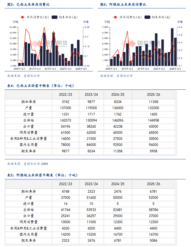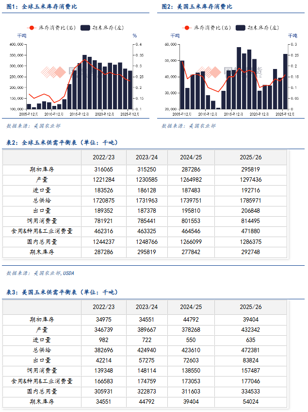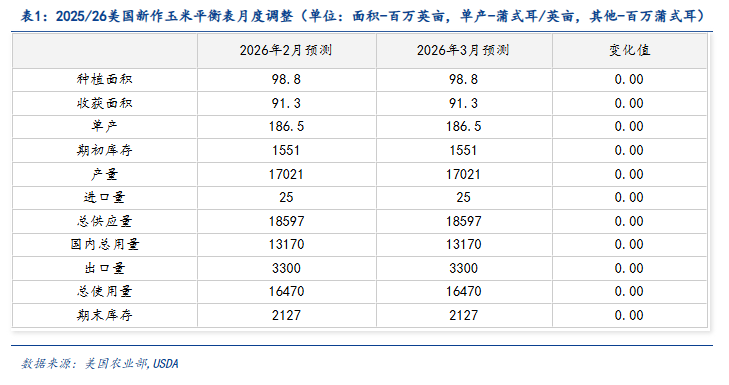 | 北京时间3月11日凌晨,美国农业部发布3月农产品供需报告。报告显示,美玉米数据整体未做调整。一般来说3月报告不会在单产/产量等关键数据上做出重大调整,数据会跟随1月的“定产报告”。2025/26年度美国玉米期末库存不变,仍为21.27亿蒲,这低于市场预期的21.55亿蒲。报告发出后,美玉米价格继续跟随能源波动。 全球方面,2025/26年度全球玉米产量为12.9744亿吨,较上一年度增加了6685万吨,较2月预测值增加了153万吨,其中乌克兰调增了170万吨,巴西调增了100万吨,阿根廷调减了100万吨。乌克兰产量上调是基于国家统计局的最新信息,巴西产量上调是因为其首次种植区的产量有所增加,阿根廷产量下调,因为 2 月份的干旱降低了其产量预期。2025/26 年度全球主要贸易变化为印度玉米出口增加。全球玉米期末库存为2.9275亿吨,较2月预测增加了377万吨。 总的来说,近期国际原油价格上下波动较大,作为美国燃料乙醇的主要原材料,美玉米价格跟随原油价格波动幅度较大,短期影响大于基本面。但美玉米产量新高,虽然本季美玉米出口预期强劲,可期末库存的绝对数据21.27亿蒲式耳仍处于历史较高水平。未来美玉米回归基本面后,或还将在底部震荡运行。