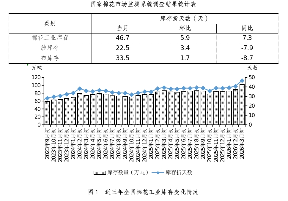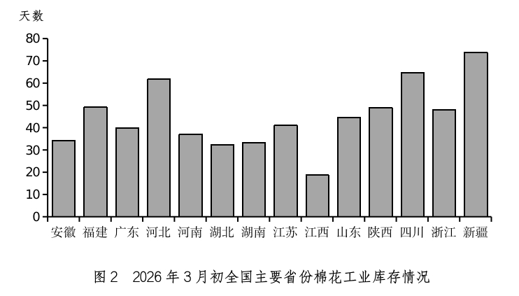 | 报告品种:棉花 原文链接:https://mp.weixin.qq.com/s/iF4shysN7mX5N9yekL_D_g 一、3月初全国棉花工业库存约102.4万吨 据国家棉花市场监测系统对全国14个省(市、自治区)72家纺织企业的调查显示,截至2026年3月初,被调查企业棉花平均库存使用天数约为46.7天(含到港进口棉数量),环比增加5.9天,同比增加7.3天,比近五年同期平均水平增加5.4天。测算全国棉花工业库存约102.4万吨,环比增加14.5%,同比增加18.5%,比近五年同期平均水平增加16.7%(如表、图1)。全国主要省份棉花工业库存状况不一,新疆、四川、河北、福建省棉花工业库存折天数相对较高(如图2)。