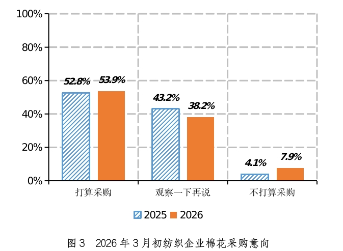 二、原料采购意愿略增,配棉意向小幅增加 采购意向调查显示,2026年3月初,准备采购棉花的企业占53.9%,环比增加7.4个百分点,同比增加1.1个百分点,比近五年同期平均水平减少2.0个百分点;持观望态度的占38.2%,环比减少12.2个百分点,同比减少5.0个百分点,比近五年同期平均水平减少1.8个百分点;不打算采购棉花的企业占7.9%,环比增加4.8个百分点,同比增加3.8个百分点,比近五年同期平均水平增加3.8个百分点(如图3)。