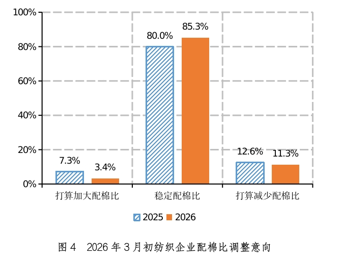 配棉意向调查显示,2026年3月初,85.3%的企业打算稳定配棉比,环比减少1.2个百分点,同比增加5.3个百分点,比近五年同期平均水平减少3.7个百分点;3.4%的企业打算加大配棉比,环比增加1.4个百分点,同比减少3.9个百分点,比近五年同期平均水平减少0.8个百分点;11.3%的企业打算降低配棉比,环比减少0.2个百分点,同比减少1.3个百分点,比近五年同期平均水平增加4.7个百分点(如图4)。