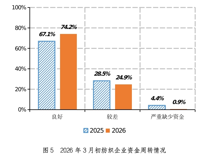三、企业资金周转、用工情况环比走弱 2026年3月初,资金周转良好的企业占74.2%,环比减少2.4个百分点,同比增加7.1个百分点,比近五年同期平均水平增加6.5个百分点;资金周转较差的占24.9%,环比增加2.1个百分点,同比减少3.6个百分点,比近五年同期平均水平持平;严重缺少资金的占0.9%,环比增加0.2个百分点,同比减少3.5个百分点,比近五年同期平均水平减少6.5个百分点(如图5)。