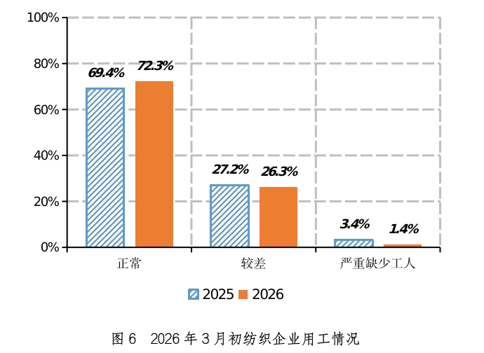 2026年3月初,72.3%的企业用工情况正常,环比减少2.3个百分点,同比增加2.9个百分点,比近五年同期平均水平增加9.5个百分点;26.3%的企业用工情况较差,环比增加0.9个百分点,同比减少0.9个百分点,比近五年同期平均水平减少3.5个百分点;1.4%的企业严重缺少工人,环比增加1.4个百分点,同比减少2.0个百分点,比近五年同期平均水平减少6.0个百分点(如图6)。