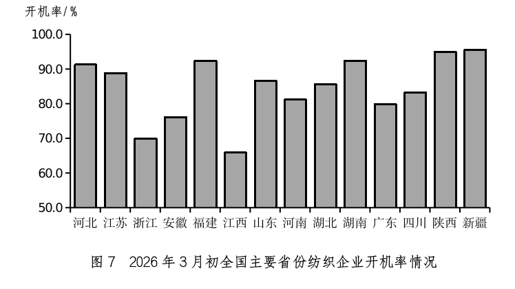 四、企业开机率与上月下降 2026年3月初,被调查企业开机率为85.8%,环比下降2.4个百分点,同比下降0.8个百分点,河北、福建、新疆、陕西、湖南省平均开机率达90%以上(如图7)。