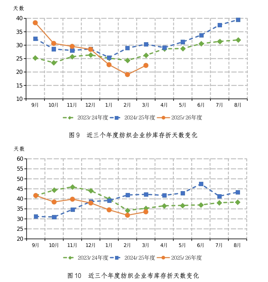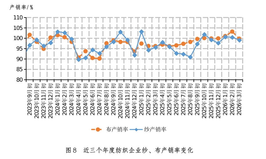 五、纱、布产销率环比略降,产品库存环比略增 2026年3月初,被调查企业纱产销率为99.1%,环比下降1.4个百分点,同比提高3.5个百分点,比近五年同期平均水平提高3.1个百分点;库存为22.5天销售量,环比增加3.4天,同比减少7.9天,比近五年同期平均水平减少3.3天(如图8、图9)。布的产销率为99.8%,环比下降3.4个百分点,同比提高3.6个百分点,比近五年同期平均水平提高7.1个百分点;库存为33.5天销售量,环比增加1.7天,同比减少8.7天,比近五年同期平均水平减少8.2天(如图8、图10)。