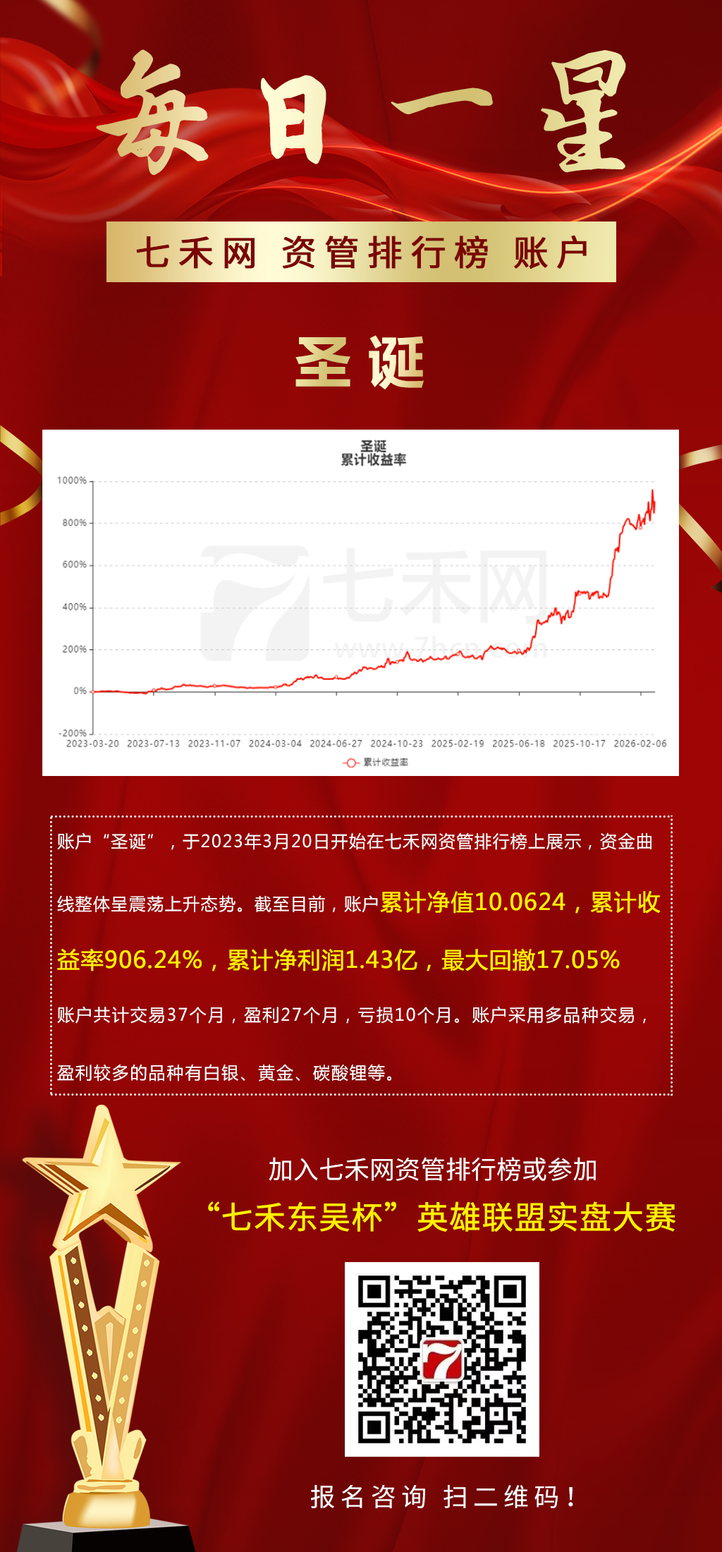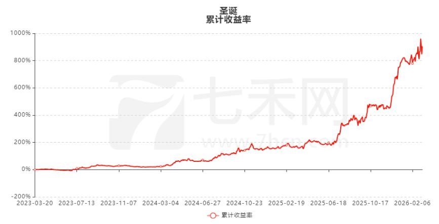 账户“圣诞”,于2023年3月20日开始在七禾网资管排行榜上展示,资金曲线整体呈震荡上升态势。截至目前,账户累计净值10.0624,累计收益率906.24%,累计净利润1.43亿,最大回撤17.05%