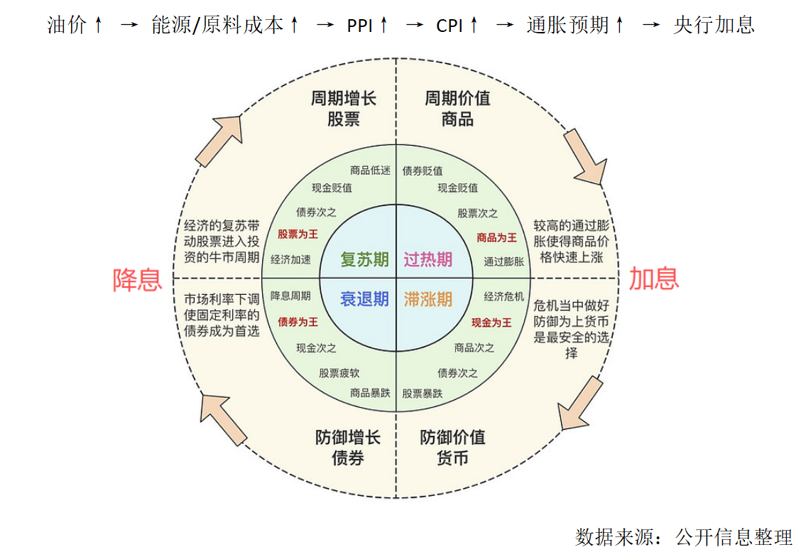 经典的美林时钟中,复苏和过热期通胀的回升由需求端的复苏所“拉升”,大宗商品价格稳步上升。但本轮美伊冲突则是通过供应端来“推升”通胀,除有色和贵金属外,其余大宗商品大多呈急速拉升。若最终真的需要加息来解决高物价的问题,对于本就缺位的需求便是雪上加霜,这一微妙区别恐怕会加速全球经济周期的转换,实现被动的滞涨,价格狂欢过后是更长久的一地鸡毛。 四、总结及未来展望 总结来看,本次美伊冲突对原油市场的影响几乎集合了过往历次石油危机中所有加剧供应紧张的条件:产量损失大、流量立刻恢复有难度、海湾地区航行的安全信心下降、本应充当救市主的欧佩克+出口受阻、抛储托底的时间有限,甚至若美伊冲突拖到年中前的夏季旺季补库来临时,全球石油供需矛盾还会进一步恶化。 结合以往石油危机油价的涨跌规律,本轮油价在高位运行的时间可能比市场想象的更长。它将不再重复过去两年“地缘一缓和、油价即回落”的模式,战前的价格底部已被实质性抬升。尽管4亿桶的战略储备能在短期内缓解压力,但其仅能覆盖霍尔木兹海峡约一个月的出口量。一旦封锁持续,不排除油价进一步冲击新高的可能。 对于上涨后的回调路径,无论是通过航道恢复还是美联储加息来实现,下跌速度大概率慢于上涨。若以通航为拐点,油价重心将在产量恢复速度被逐步验证的过程中缓慢下移;若局势失控,最终迫使美联储通过加息来遏制通胀,供应端对通胀的推涨恐加速全球经济周期的转换,实现被动滞涨。价格狂欢过后是更长久的一地鸡毛,油价也将由此进入新一轮“牛短熊长”的漫长调整期。 责任编辑:七禾编辑 |
