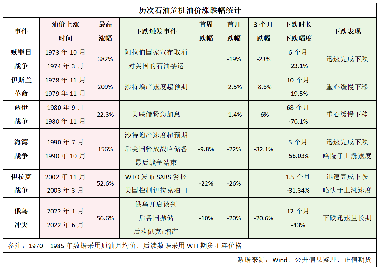 自1970年以来,全球共经历了六次对石油供应造成重大冲击的军事冲突,油价涨幅介于22.3%至382%之间,持续时间从两个月到一年不等,具体幅度与持续性主要取决于对石油供应的实际影响。影响最大的当属赎罪日战争中阿拉伯产油国的集体减产和对西方国家的石油禁运;其次是伊斯兰革命和两伊战争时,伊朗和伊拉克两国石油产量的下滑;海湾战争同样也涉及到伊拉克和科威特两国的减产,因此油价涨幅达156%;而伊拉克战争与俄乌冲突仅涉及单一主要产油国,涨幅均在50%左右。 本轮美伊冲突自2月最后一周爆发军事摩擦以来,WTI油价最高涨幅已达77.6%。若将起点追溯至市场开始对地缘风险进行提前定价的美伊核谈判重启阶段,涨幅已达92.7%。 回顾历次战争以及后续油价下跌呈现的规律,可将油价转跌的关键事件分为三类: (1)缘起缘灭,冲突结束直接触发下跌。如赎罪日战争、海湾战争以及俄乌冲突,都是在战局发生了明显转变时,油价立刻见顶。同时下跌速度较快,基本在拐点后一个月内就实现了整个下跌周期的大部分跌幅。 (2)供应端补偿增产救市,典型如各国释放战略储备或欧佩克+增产。例如伊斯兰革命、海湾战争及俄乌冲突期间,均通过外部增产缓解供应缺口。此类下跌过程较为缓慢,市场需时间验证增产规模与实际效果,油价重心逐步下移。 (3)需求端宏观冲击。通过抑制原油需求来平衡供需,从而压制油价。例如伊拉克战争期间的油价上涨,即被SARS疫情爆发所中断;两伊战争期间,美国则通过加息应对油价飙升。近年来,类似宏观“黑天鹅”事件频发,核心逻辑均为削弱市场对原油需求前景的预期。 二、本轮美伊冲突对原油市场冲击的特殊性 (1)潜在产量损失为历史之最。本轮冲突导致的产量下降预期远超以往,主因伊朗从实际行动上中断了霍尔木兹海峡的通行,该海峡掌握着整个中东海湾地区的石油出口,约占全球石油需求的20%。据高盛最新报告的数据,2025年经由该海峡出口的原油平均达1340万桶/日,而据EIA最新3月报,预计2026年全球原油供应过剩187万桶/日,若封锁持续,全球原油供需格局将彻底逆转。如此规模的供应短缺则只有赎罪日战争中阿拉伯国家的联合减产能匹敌,而目前的油价涨幅远未及当年。 (2)被动减产延缓恢复进程。与赎罪日战争期间的“主动减产”不同,本轮冲突导致的是“被动停产”—出口通道受阻、储存设施饱和所致的减产。目前伊拉克、沙特、阿联酋及科威特等国已实质性减产,总量约600万桶/日,相当于全球供应减少6%。即便海峡恢复通行,也需时间消化积压库存,产量恢复将慢于以往。此外海峡较难被封锁的心理边界已被打破,中东局势不稳对航运造成突发威胁或成常态,能不能“持续”通行将会成为原油产量恢复最大的疑点。 (3)外部增产能力有限,抛储作用或杯水车薪。以往都是欧佩克+承担救市主的角色,但本次却是直接受害者。3月11日国际能源署(IEA)宣布启动史上最大的联合释储行动,32个成员国已同意释放4亿桶战略石油储备。极端情况下,若海峡持续零通行状态,按照2025年日均1340万桶的通行量,4亿桶战略储备约仅能补足霍尔木兹海峡1个月的原油出口量,若封锁超过该时间,不排除油价进一步冲击新高的可能。 三、本轮油价上涨对宏观经济的传导及影响 石油作为现代工业的血液和基础能源,有两大重要用途,一是作为基础燃料,二则是作为化工原料。其价格上涨通常通过三个环节向宏观经济传导:成本推动、通胀预期与货币政策调整。成本推动阶段,石油短缺在短期上会迅速反映为日常运输价格的上涨以及全球供应链上游原料短缺造成的涨价,这也是近期化工板块演绎的逻辑。随之而来,中游制造业在难以承受成本压力后选择将压力向下游转移。先是生产成本的层层加码,再到生活成本的全面上涨,最终实现通胀由预期到现实的迈进。而货币政策具有一定的先行性,当全球央行尤其是美联储观察到油价上涨或会引发全面、持续的通胀,就会采取紧缩性货币政策,典型如加息,通过提高全社会资金成本来达到抑制总需求,实现降低通胀的作用。