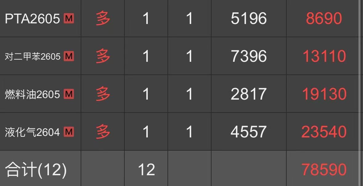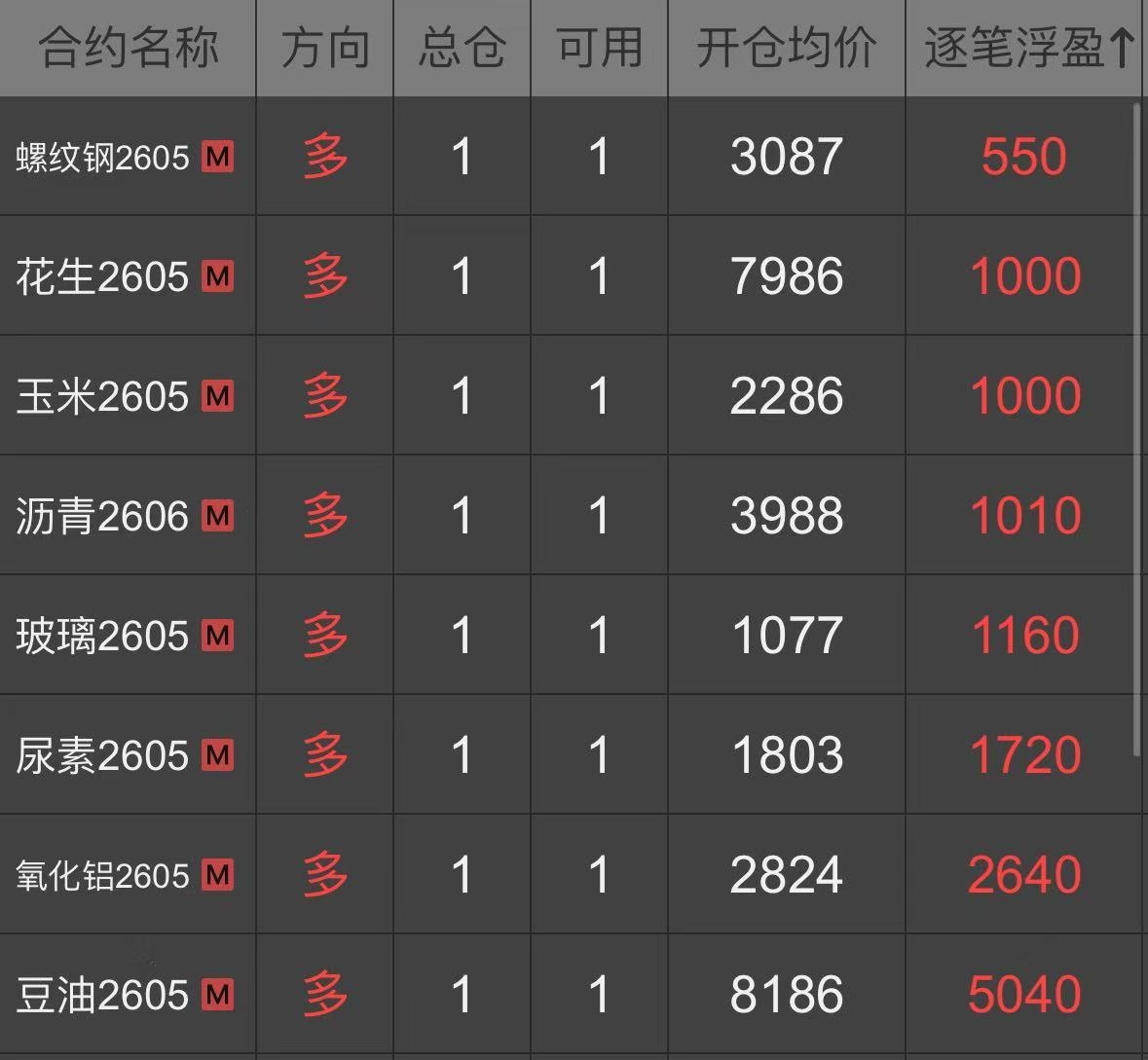 | 一、开仓总结 燃料油:2026年1月9日,达到启动点的开仓条件,所以在14:56开多一手燃料油2603合约,开仓价为2514。燃料油2603合约于2026年2月5日21:35移仓至主力合约2605,开仓价为2817。 PTA:2026年2月10日,达到启动点的开仓条件,所以在14:53开多一手PTA2605合约,开仓价为5230。 玉米:2026年2月10日,达到启动点的开仓条件,所以在14:53开多一手玉米2605合约,开仓价为2286。 尿素:2026年2月11日,达到启动点的开仓条件,所以在14:42开多一手尿素2605合约,开仓价为1803。 沥青:2026年2月25日,达到启动点的开仓条件,所以在14:50开多一手沥青2604合约,开仓价为3359。沥青2604合约于2026年3月12日14:41移仓至主力合约2606,开仓价为3988。 豆油:2026年2月26日,达到启动点的开仓条件,所以在14:45开多一手豆油2605合约,开仓价为8186。 液化气:2026年2月26日,达到启动点的开仓条件,所以在14:45开多一手液化气2604合约,开仓价为4557。 对二甲苯:2026年2月27日,达到启动点的开仓条件,所以在14:53开多一手对二甲苯2605合约,开仓价为7396。 氧化铝:2026年3月6日,达到启动点的开仓条件,所以在14:46开多一手氧化铝2605合约,开仓价为2824。 螺纹钢:2026年3月6日,达到启动点的开仓条件,所以在14:47开多一手螺纹钢2605合约,开仓价为3087。 玻璃:2026年3月10日,达到启动点的开仓条件,所以在14:57开多一手玻璃2605合约,开仓价为1077。 花生:2026年3月10日,达到启动点的开仓条件,所以在14:59开多一手花生2605合约,开仓价为7986。 二、平仓计划 燃料油:达到启动点的平仓止损/止盈条件,在收盘前或下一个交易日开盘后全部平仓。 PTA:达到启动点的平仓止损/止盈条件,在收盘前或下一个交易日开盘后全部平仓。 玉米:达到启动点的平仓止损/止盈条件,在收盘前或下一个交易日开盘后全部平仓。 尿素:达到启动点的平仓止损/止盈条件,在收盘前或下一个交易日开盘后全部平仓。 沥青:达到启动点的平仓止损/止盈条件,在收盘前或下一个交易日开盘后全部平仓。 豆油:达到启动点的平仓止损/止盈条件,在收盘前或下一个交易日开盘后全部平仓。 液化气:达到启动点的平仓止损/止盈条件,在收盘前或下一个交易日开盘后全部平仓。 对二甲苯:达到启动点的平仓止损/止盈条件,在收盘前或下一个交易日开盘后全部平仓。 氧化铝:达到启动点的平仓止损/止盈条件,在收盘前或下一个交易日开盘后全部平仓。 螺纹钢:达到启动点的平仓止损/止盈条件,在收盘前或下一个交易日开盘后全部平仓。 玻璃:达到启动点的平仓止损/止盈条件,在收盘前或下一个交易日开盘后全部平仓。 花生:达到启动点的平仓止损/止盈条件,在收盘前或下一个交易日开盘后全部平仓。 注:本交易总结由第三方提供,只作为投资理念和方法的交流,不作为七禾网的观点,也不作为投资参考和建议。 附: 1、交易者简介 十年股票/期货/外盘交易经验,每年都实现投资盈利。 擅长微观盘面分析和宏观市场分析,总结了数套有效的盈利模式,和众多高手有深入交流,收益良好。 2、持仓截图
